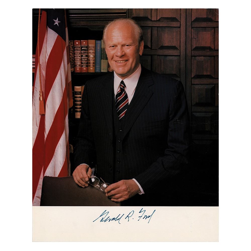 Color semi-glossy 8 x 10 photo of Ford standing next to the American flag, signed in the lower border in black felt tip, "Gerald R. Ford." In very good to fine condition, with a few faint bends.