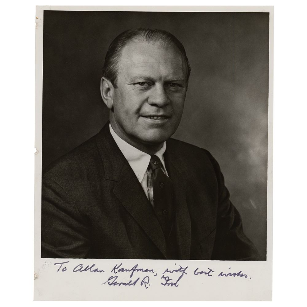 Glossy 8 x 10 head-and-shoulders photo, signed and inscribed in the lower border in black felt tip, "To Allan Kaufman, with best wishes, Gerald R. Ford.†In very good to fine condition, with scattered small creases, ad three binder dings to the left edge.