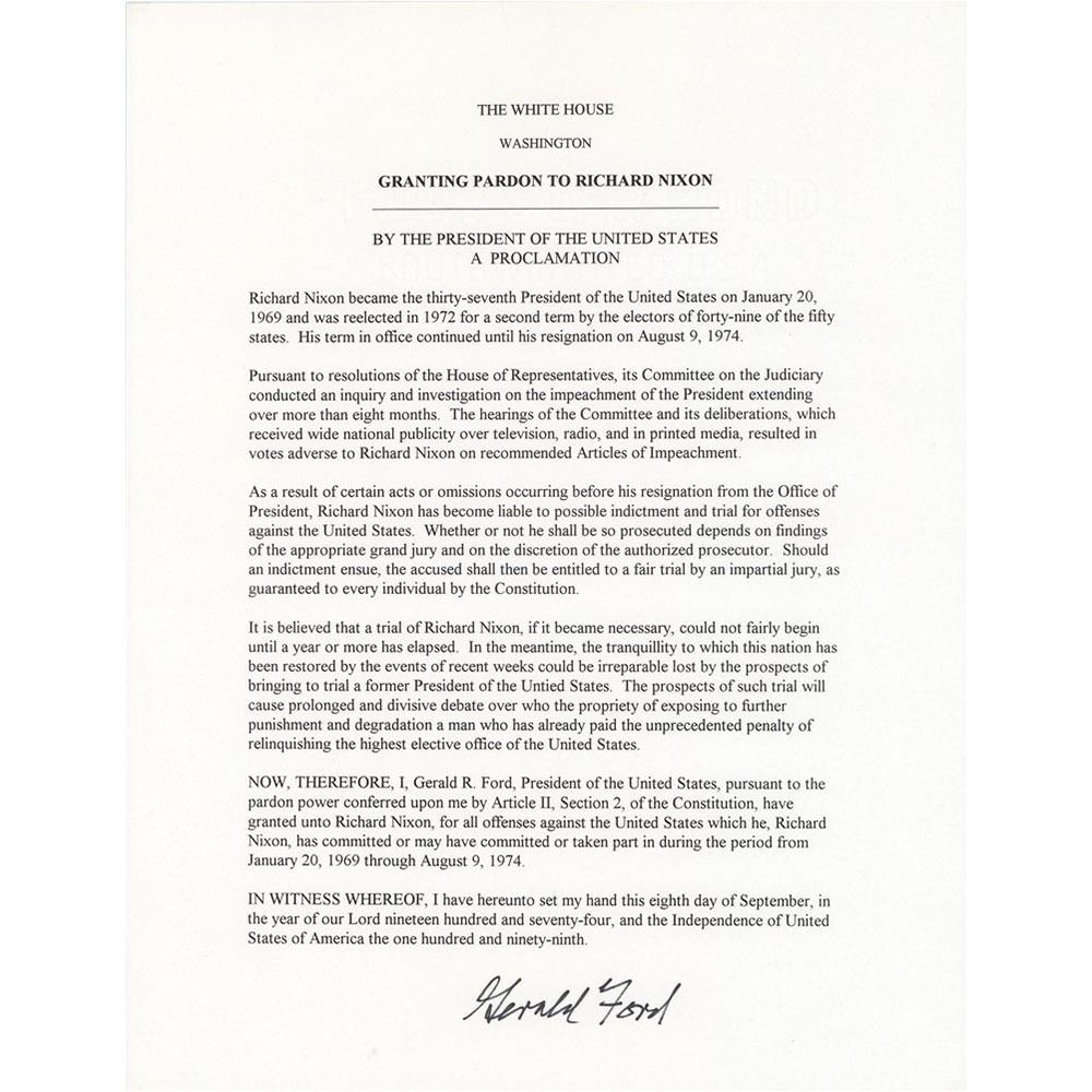 Souvenir typescript of Ford's pardon of his predecessor Richard Nixon, one page, 8.5 x 11, signed at the conclusion in black felt tip by Gerald Ford. In part: "I, Gerald R. Ford, President of the United States, pursuant to the pardon power conferred upon me by Article II, Section 2, of the Constitution, have granted unto Richard Nixon, for all offenses against the United States." In fine condition.