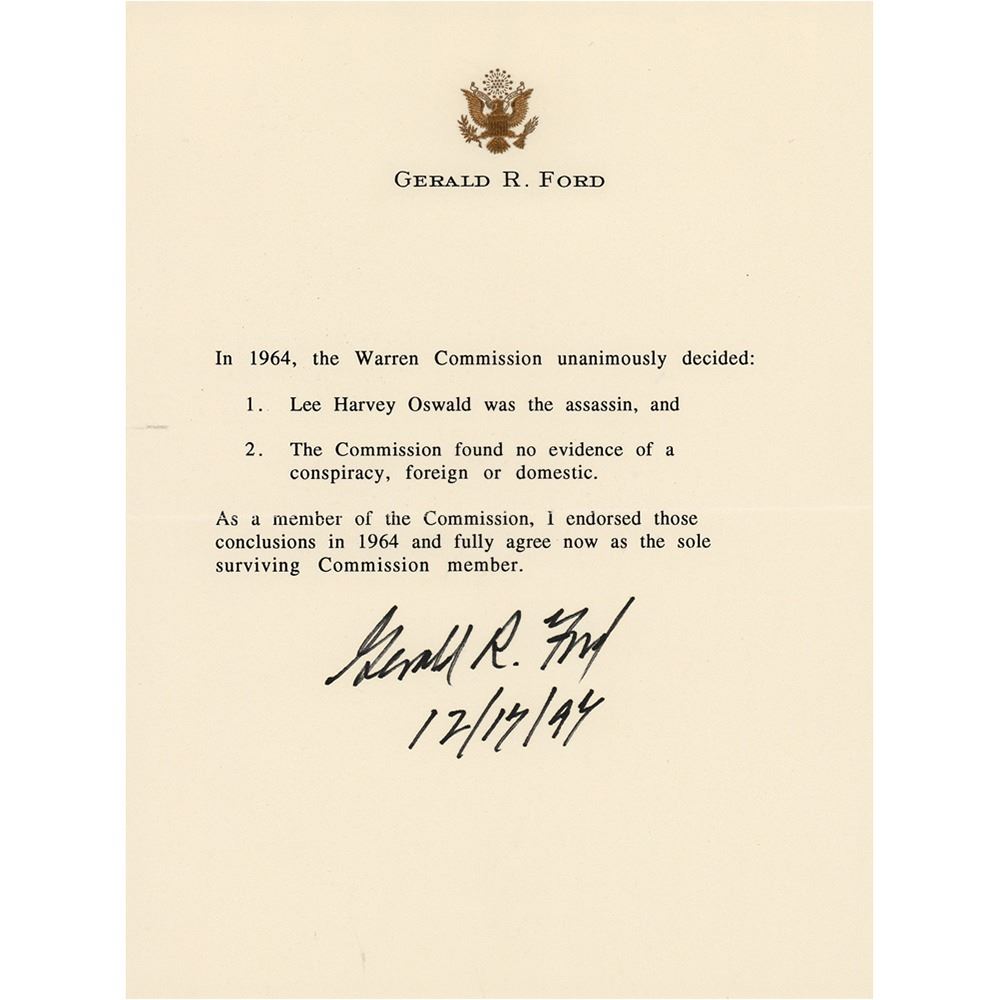 Souvenir typescript on an off-white 6.25 x 8.5 sheet of personal letterhead with an embossed presidential eagle, signed in black felt tip, "Gerald R. Ford, 12/17/97." The statement, which regards the findings of the Warren Commission following the assassination of President John F. Kennedy, in full: "In 1964, the Warren Commission unanimously decided: 1. Lee Harvey Oswald was the assassin, and 2. The Commission found no evidence of a conspiracy, foreign or domestic. As a member of the Commission, I endorsed those conclusions in 1964 and fully agree now as the sole surviving Commission member." In very fine condition.