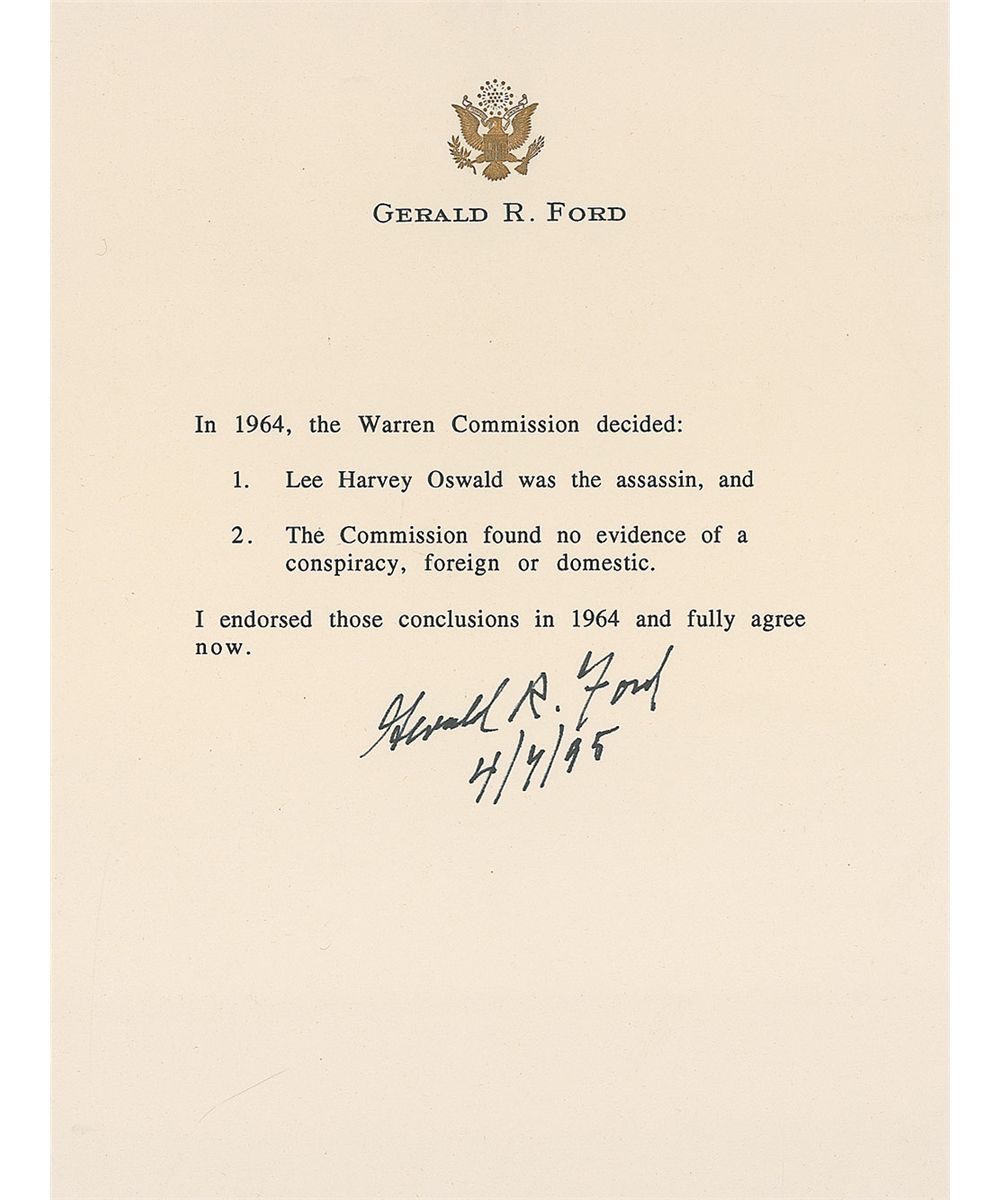 Souvenir typescript on a cream 6.25 x 8.5 sheet of personal letterhead with embossed presidential eagle, signed in black felt tip, “Gerald R. Ford, 4/7/95.” Ford’s statement regarding the findings of the Warren Commission. In full: “In 1964, the Warren Commission unanimously decided: 1. Lee Harvey Oswald was the assassin, and 2. The Commission found no evidence of a conspiracy, foreign or domestic. As a member of the Commission, I endorsed these conclusions in 1964 and fully agree now as the sole surviving Commission member.” In very fine condition.
