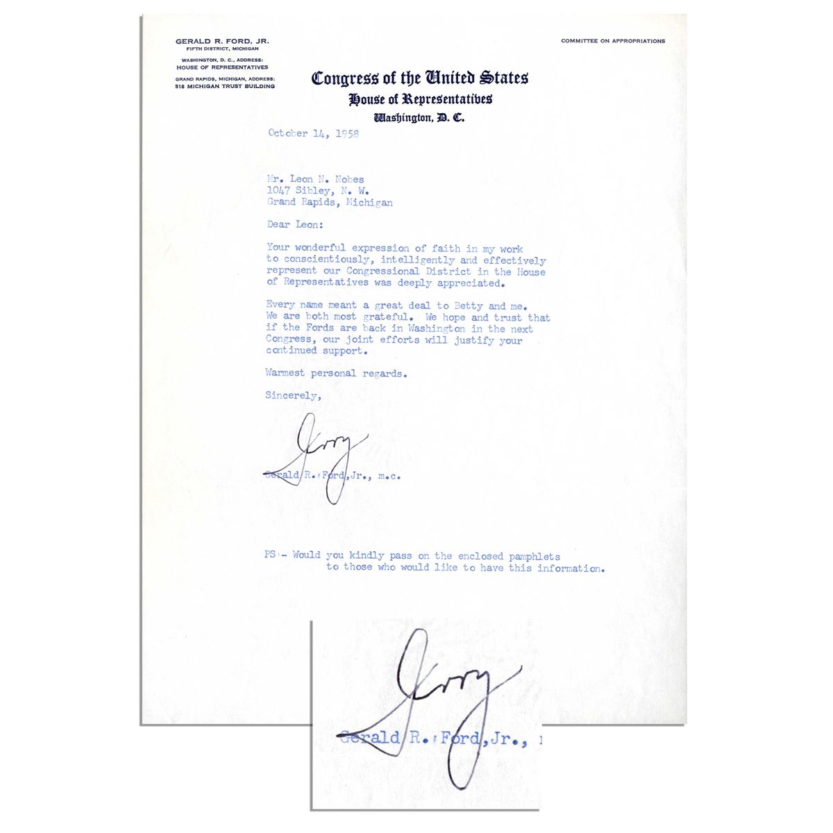 Typed letter signed by Gerald Ford on U.S. House stationery, dated 14 October 1958. In part, ''Your wonderful expression of faith in my work to conscientiously, intelligently and effectively represent our Congressional District…was deeply appreciated. Every name meant a great deal to Betty and me…We hope and trust that if the Fords are back in Washington in the next Congress, our joint efforts will justify your continued support…Jerry / PS - Would you kindly pass on the enclosed pamphlets…'' Single page measures 8'' x 10.5''. Near fine.