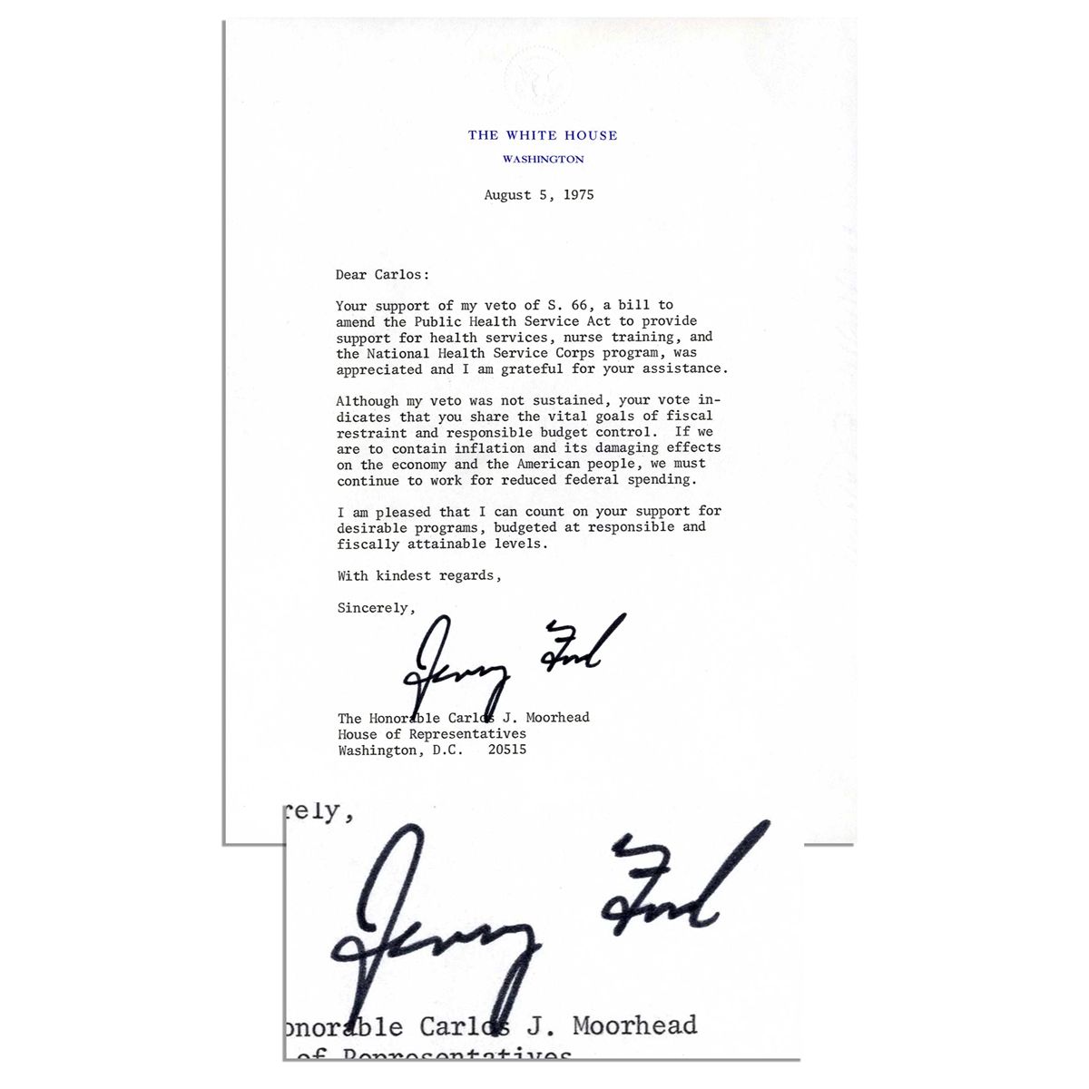 Gerald Ford typed letter signed, advocating restraint in federal spending almost 40 years ago. Dated 5 August 1975 on White House letterhead, Ford thanks Congressman Carlos Moorhead for ''your support of my veto of S. 66, a bill to…provide support for health services [and] nurse training…you share the vital goals of fiscal restraint and responsible budget control…I am pleased that I can count on your support for desirable programs, budgeted at responsible…levels…Jerry Ford''. Single page measures 6.75'' x 8.75''. Near fine.