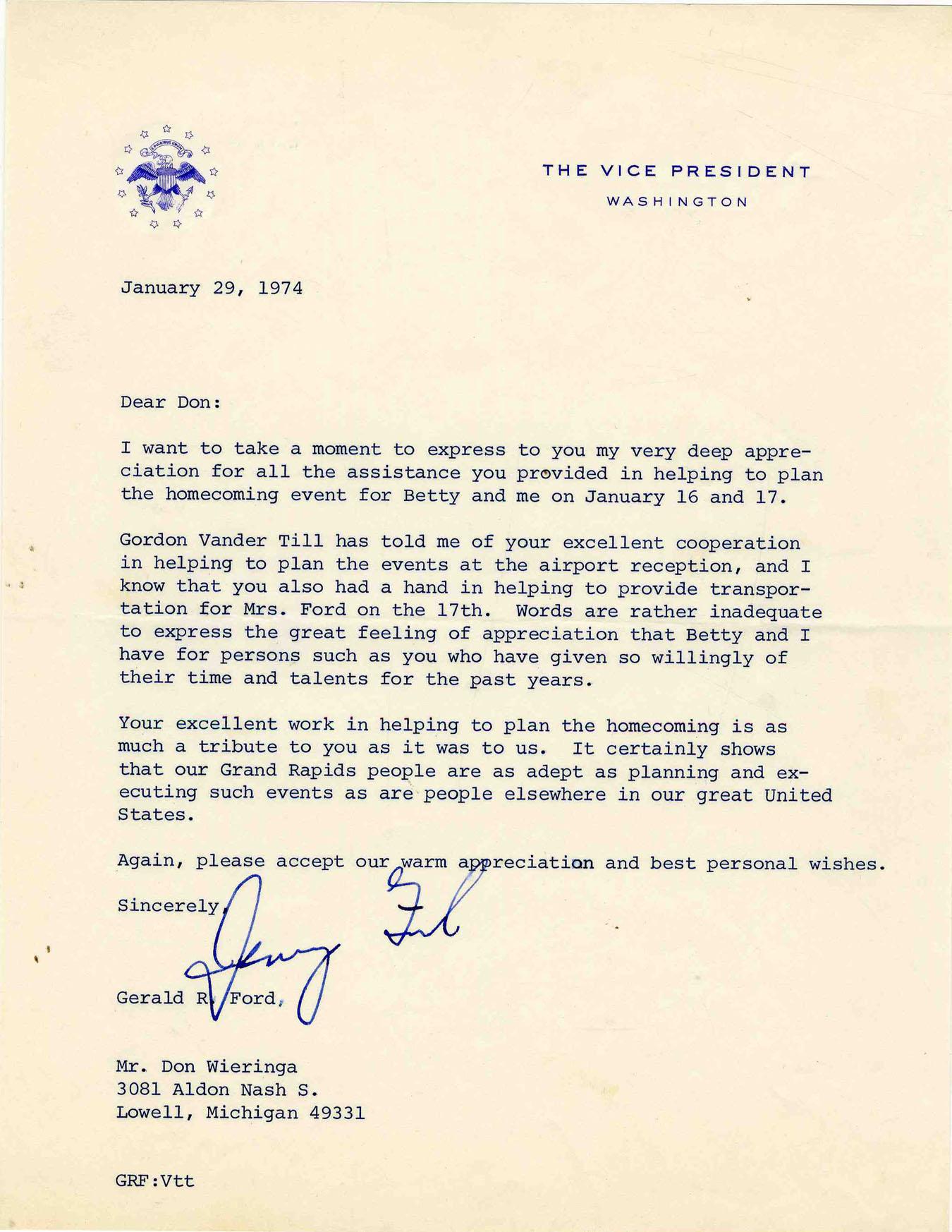 Gerald Ford typed letter signed as Vice-President dated 29 January 1974. Signed ''Jerry Ford,'' the Vice President writes to a man in Grand Rapids who helped plan Gerald and Betty Ford's homecoming. In part, ''…Words are rather inadequate to express the great feeling of appreciation…'' Letters written by Ford as Vice-President are relatively scarce as he only held the office for eight months, from December 1973 to August 1974. Measures 7'' x 9'' on Vice-Presidential letterhead. In fine condition.
