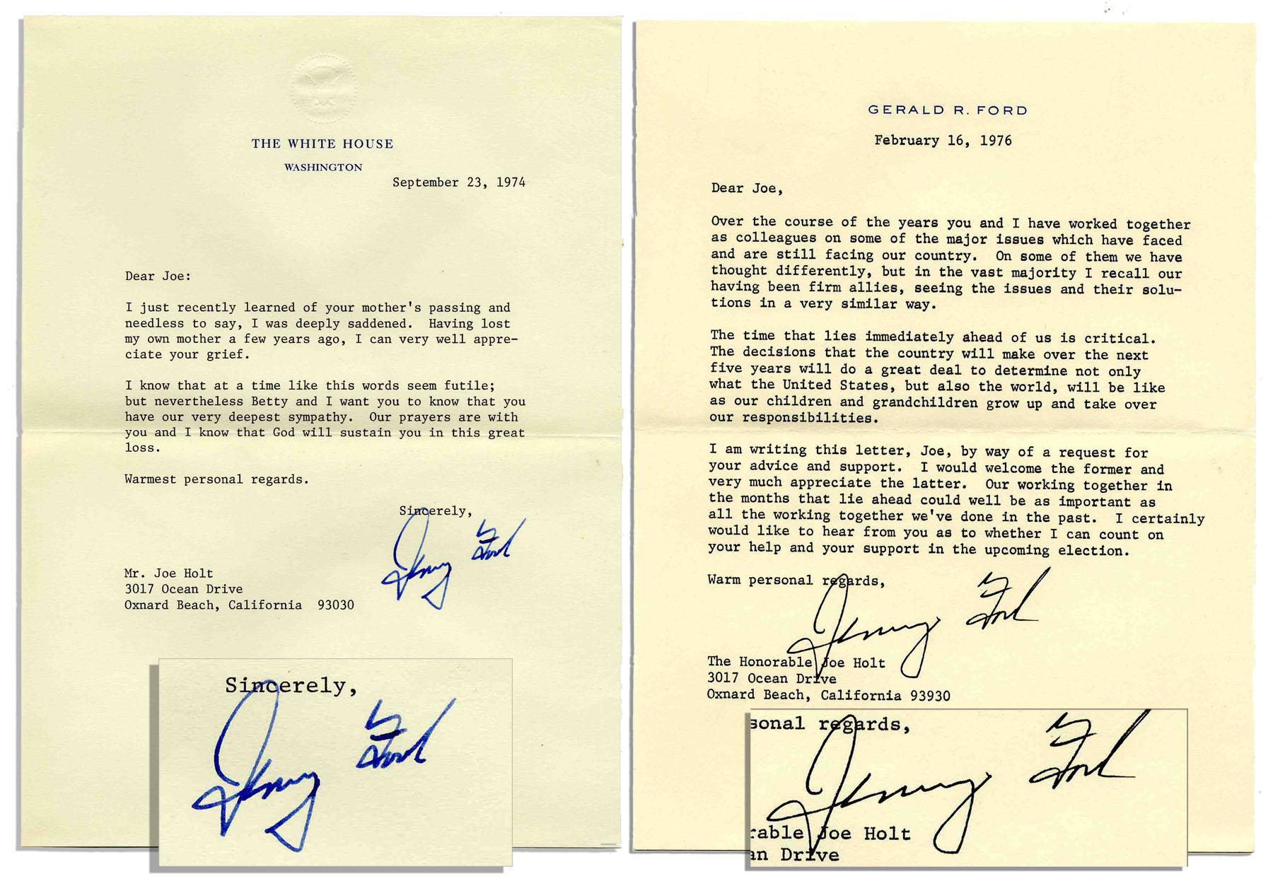 Two Gerald Ford typed letters signed as President. The first measures 6.75'' x 9'' on official White House stationery, dated 23 September 1974, and the second measures 6.25'' x 8.5'' on Ford's personal stationery, dated 16 February 1976. Both are addressed to U.S. Representative Joe Holt, with the first offering condolences at the passing of Holt's mother and the second discussing Ford's reelection: ''…The time that lies immediately ahead of us is critical…'' Also includes original White House envelope. Both near fine.