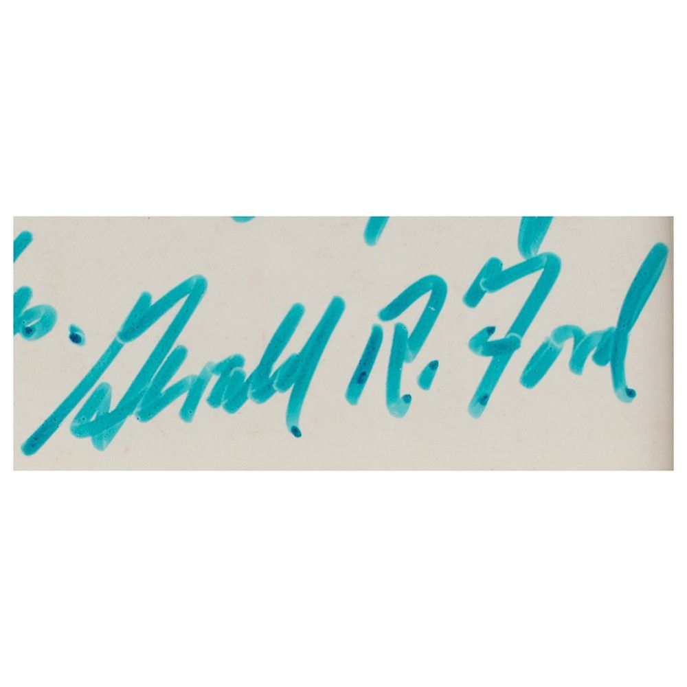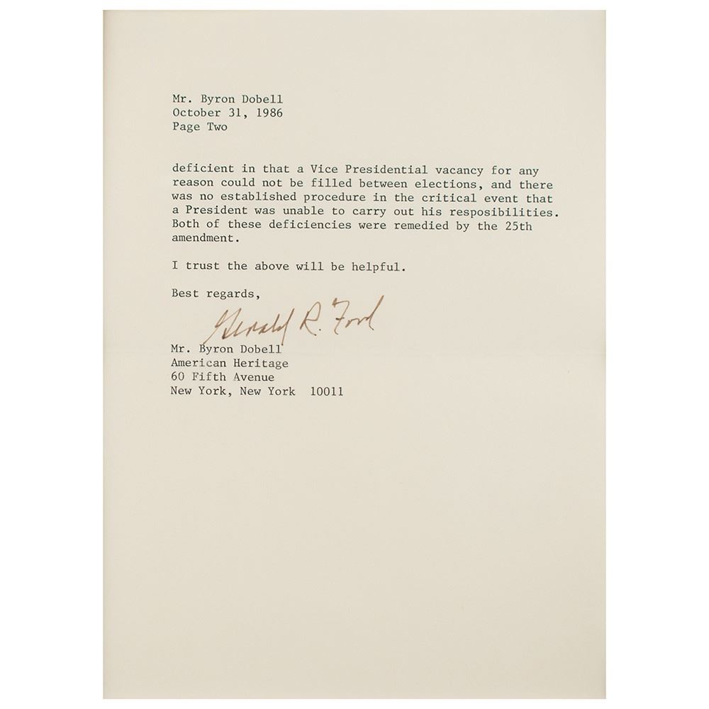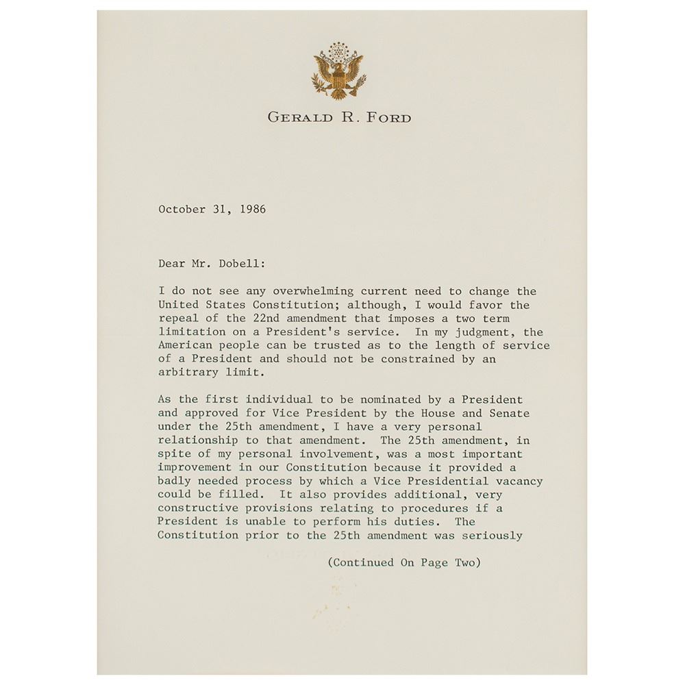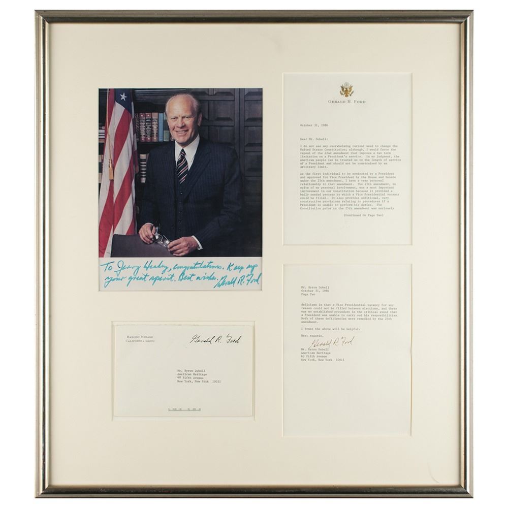 Two items: a TLS signed "Gerald R. Ford," two pages, 6 x 8.25, personal letterhead, October 31, 1986, addressed to Byron Dobell of American Heritage, in part: "I do not see any overwhelming current need to change the United States Constitution; although, I would favor the repeal of the 22nd amendment that imposes a two term limitation on a President's service. In my judgment, the American people can be trusted as to the length of service of a President and should not be constrained by an arbitrary limit. As the first individual to be nominated by a President and approved for Vice President by the House and Senate under the 25th amendment, I have a very personal relationship to that amendment. The 25th amendment, in spite of my personal involvement, was a most important improvement in our Constitution because it provided a badly needed process by which a Vice Presidential vacancy could be filled. It also provides additional, very constructive provisions relating to procedures if a President is unable to perform his duties. The Constitution prior to the 25th amendment was seriously deficient in that Vice Presidential vacancy for any reason could not be filled between elections, and there was no established procedure in the critical event that a President was unable to carry out his responsibilities. Both of these deficiencies were remedied by the 25th amendment." Also includes a glossy color 7.75 x 9.75 photo of Ford, which is signed and inscribed in the lower border in blue felt tip, "To Jerry Healey, congratulations. Keep up your great spirit. Best wishes, Gerald R. Ford." Both are matted and framed together, with the original mailing envelope that bears a printed franking signature, to an overall size of 21.25 x 23.5. In fine condition, with a small crack to glass in lower right corner.