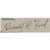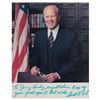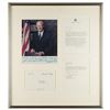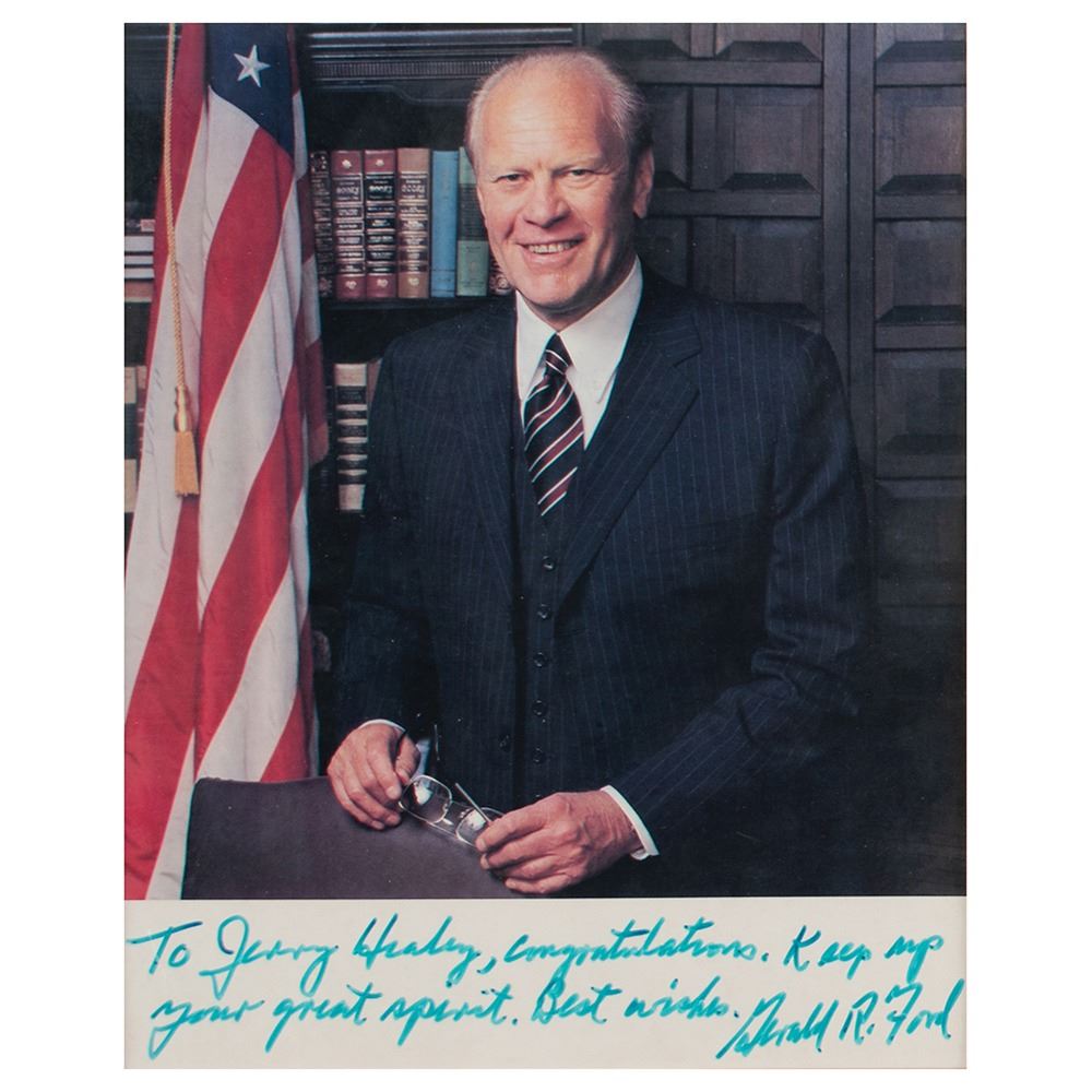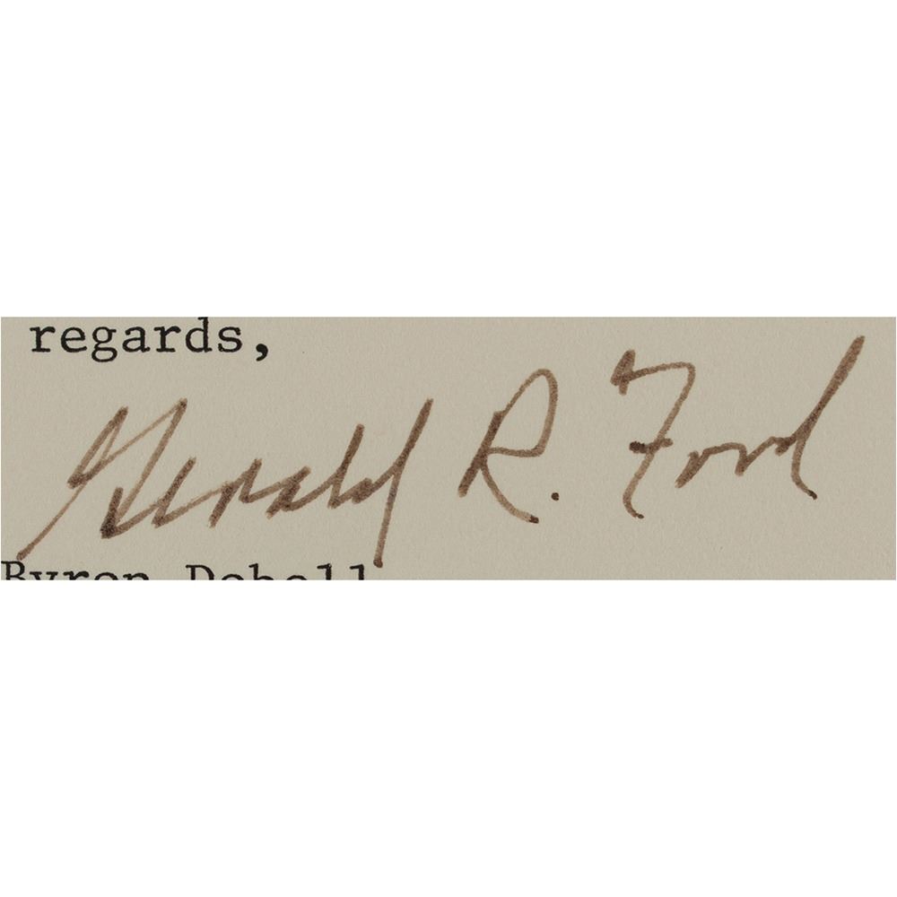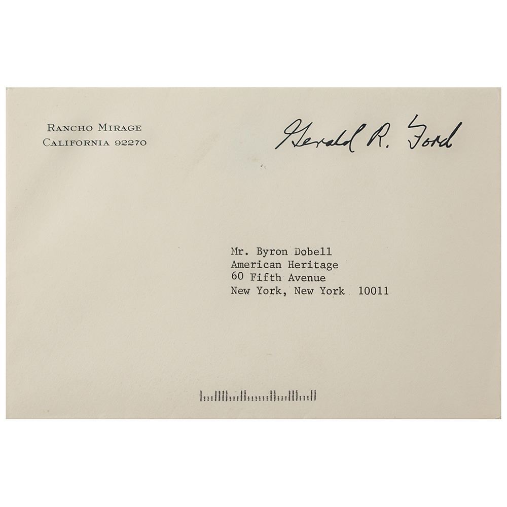 Two items: a TLS signed "Gerald R. Ford," two pages, 6 x 8.25, personal letterhead, October 31, 1986, addressed to Byron Dobell of American Heritage, in part: "I do not see any overwhelming current need to change the United States Constitution; although, I would favor the repeal of the 22nd amendment that imposes a two term limitation on a President's service. In my judgment, the American people can be trusted as to the length of service of a President and should not be constrained by an arbitrary limit. As the first individual to be nominated by a President and approved for Vice President by the House and Senate under the 25th amendment, I have a very personal relationship to that amendment. The 25th amendment, in spite of my personal involvement, was a most important improvement in our Constitution because it provided a badly needed process by which a Vice Presidential vacancy could be filled. It also provides additional, very constructive provisions relating to procedures if a President is unable to perform his duties. The Constitution prior to the 25th amendment was seriously deficient in that Vice Presidential vacancy for any reason could not be filled between elections, and there was no established procedure in the critical event that a President was unable to carry out his responsibilities. Both of these deficiencies were remedied by the 25th amendment." Also includes a glossy color 7.75 x 9.75 photo of Ford, which is signed and inscribed in the lower border in blue felt tip, "To Jerry Healey, congratulations. Keep up your great spirit. Best wishes, Gerald R. Ford." Both are matted and framed together, with the original mailing envelope that bears a printed franking signature, to an overall size of 21.25 x 23.5. In fine condition, with a small crack to glass in lower right corner.