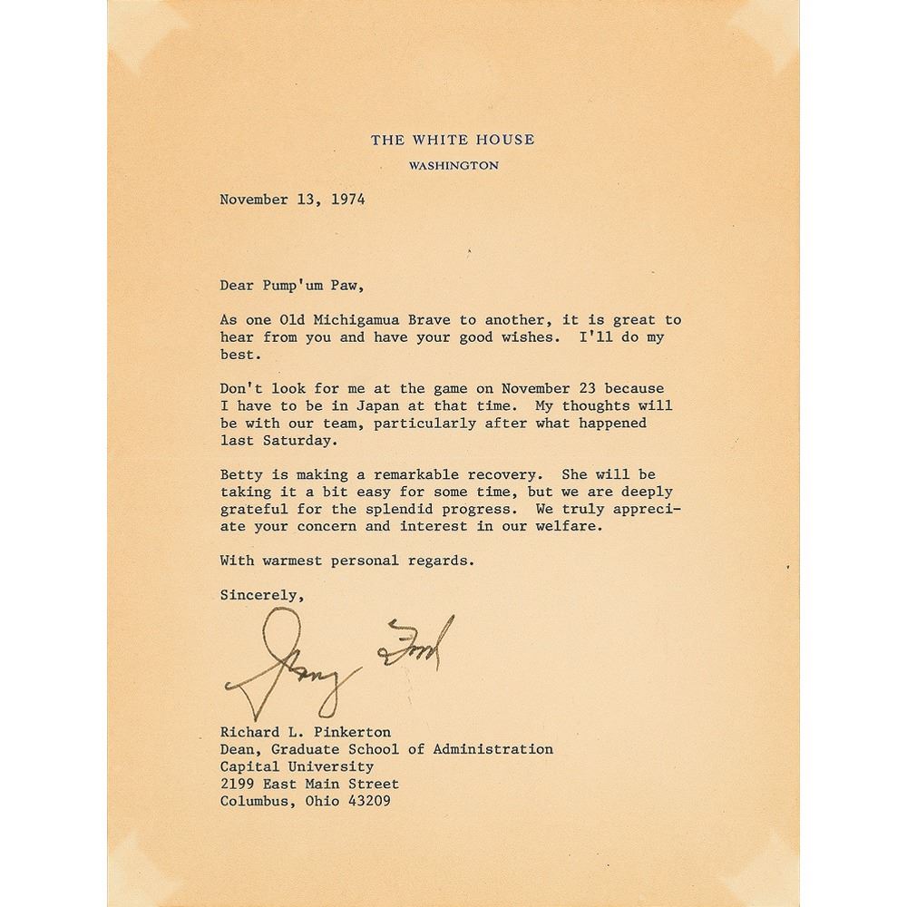 TLS as president signed “Jerry Ford,” one page, 6.75 x 8.75, White House letterhead, November 13, 1974. Letter to Capital University Dean Richard L. Pinkerton, whom Ford refers to as "Pump'um Paw," in full: "As one old Michigamua Brave to another, it is great to hear from you and have your good wishes. I'll do my best. Don't look for me at the game on November 23 because I have to be in Japan at that time. My thoughts will be with our team, particularly after what happened last Saturday. Betty is making a remarkable recovery. She will be taking it a bit easy for some time, but we are deeply grateful for the splendid progress. We truly appreciated your concern and interest in our welfare. With warmest personal regards." In very good to fine condition, with a light shade of overall toning, except at the corners. Accompanied by the original mailing envelope, as well as a letter from Pinkerton explaining the origin of the exclusive University of Michigan Michigamua club, which references Ford's tribal name of "Flipp'um Back."