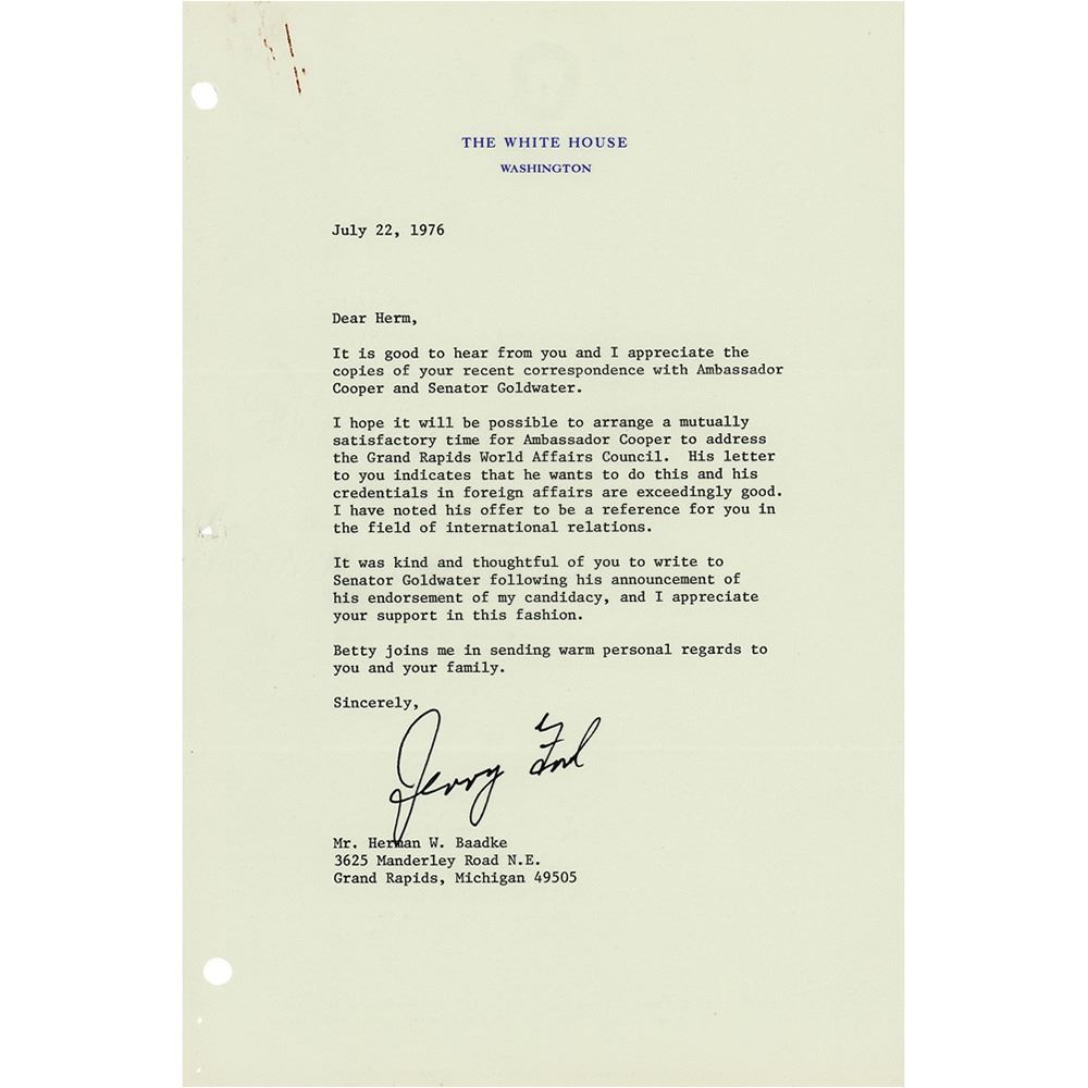 TLS as president signed “Jerry Ford,†one page, 7 x 10.5, White House letterhead, July 22, 1976. Letter to Herman Baadke, in part: "I hope it will be possible to arrange a mutually satisfactory time for Ambassador Cooper to address the Grand Rapids World Affairs Council. His letter to you indicates that he wants to do this and his credentials in foreign affairs are exceedingly good. I have noted his offer to be a reference for you in the field of international relations. It was kind and thoughtful of you to write to Senator Goldwater following his announcements of his endorsement of my candidacy.†In fine condition, with a rusty paperclip impression to the top edge, and three file holes to the left side. Accompanied by the original mailing envelope.