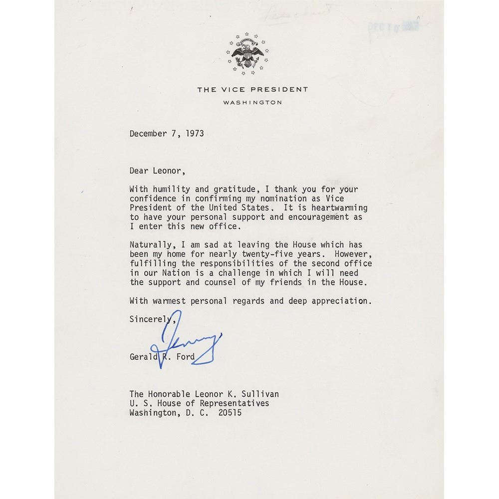 TLS as president signed “Jerry,” one page, 7 x 9, The Vice President letterhead, December 7, 1973. Letter to Missouri Congresswoman Leonor Sullivan, in part: "With humility and gratitude, I thank you for your confidence in confirming my nomination as Vice President of the United States. It is heartwarming to have your personal support and encouragement as I enter this new office. Naturally, I am sad at leaving the House which has been my home for nearly twenty-five years. However, fulfilling my responsibilities of the second office in our Nation is a challenge in which I will need the support and counsel of my friend in the House.” In fine condition.
