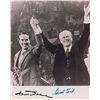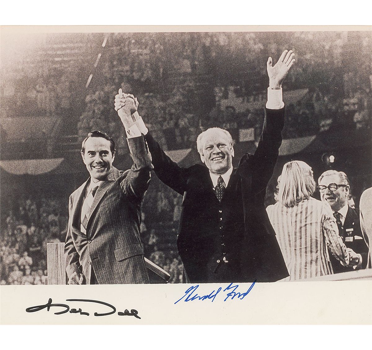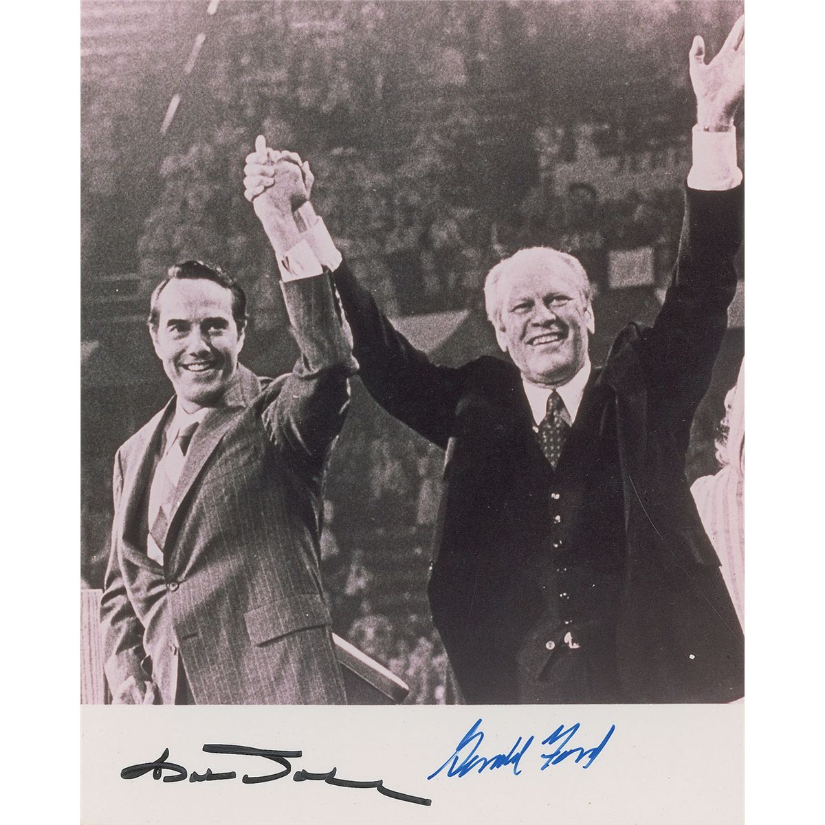 Two glossy photos of Ford and Dole celebrating on the final night of the Republican National Convention in 1976, one 8 x 10 and one 10 x 8, both signed in the lower border in blue felt tip by Ford and in black felt tip by Dole. Both are in fine condition.