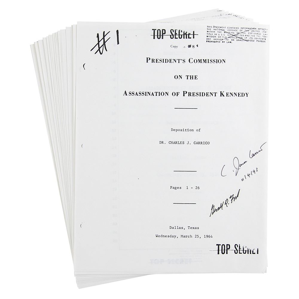 Photocopy of pages 1"“26 of Dr. Charles J. Carrico's deposition before the Warren Commission, originally labeled as "Top Secret," 8.5 x 11, signed on the cover sheet in black felt tip, "Gerald R. Ford" and "C. James Carrico, 11/4/93." Carrico was one of the doctors treating JFK at Parkland Hospital. In fine condition.