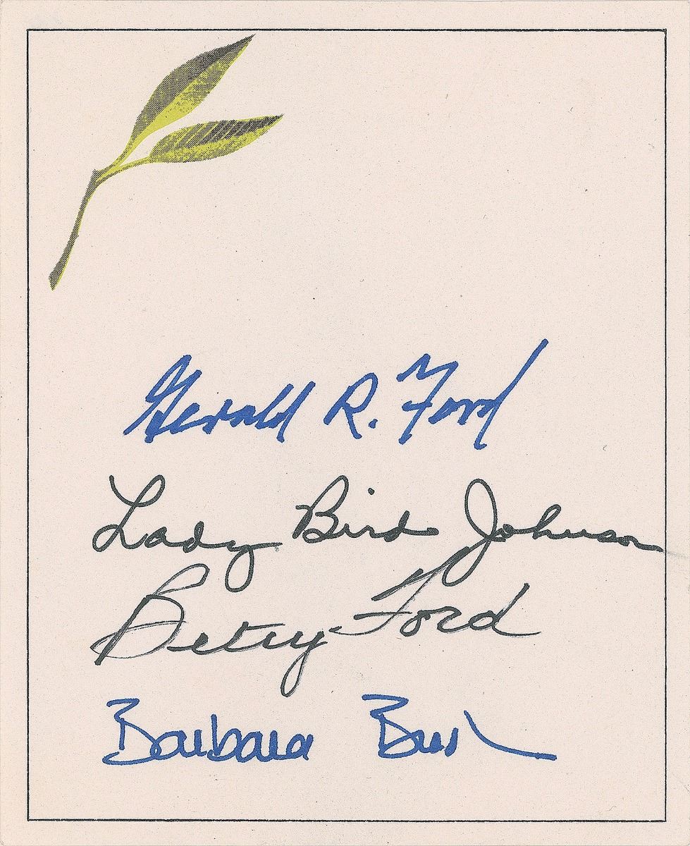 Blue felt tip signatures, “Gerald R. Ford” and “Barbara Bush,” and black ink signatures, “Lady Bird Johnson” and “Betty Ford,” on an off-white 3.5 x 4.25 stationery sheet. In fine condition. An attractive assemblage of White House residents with ample space for more.