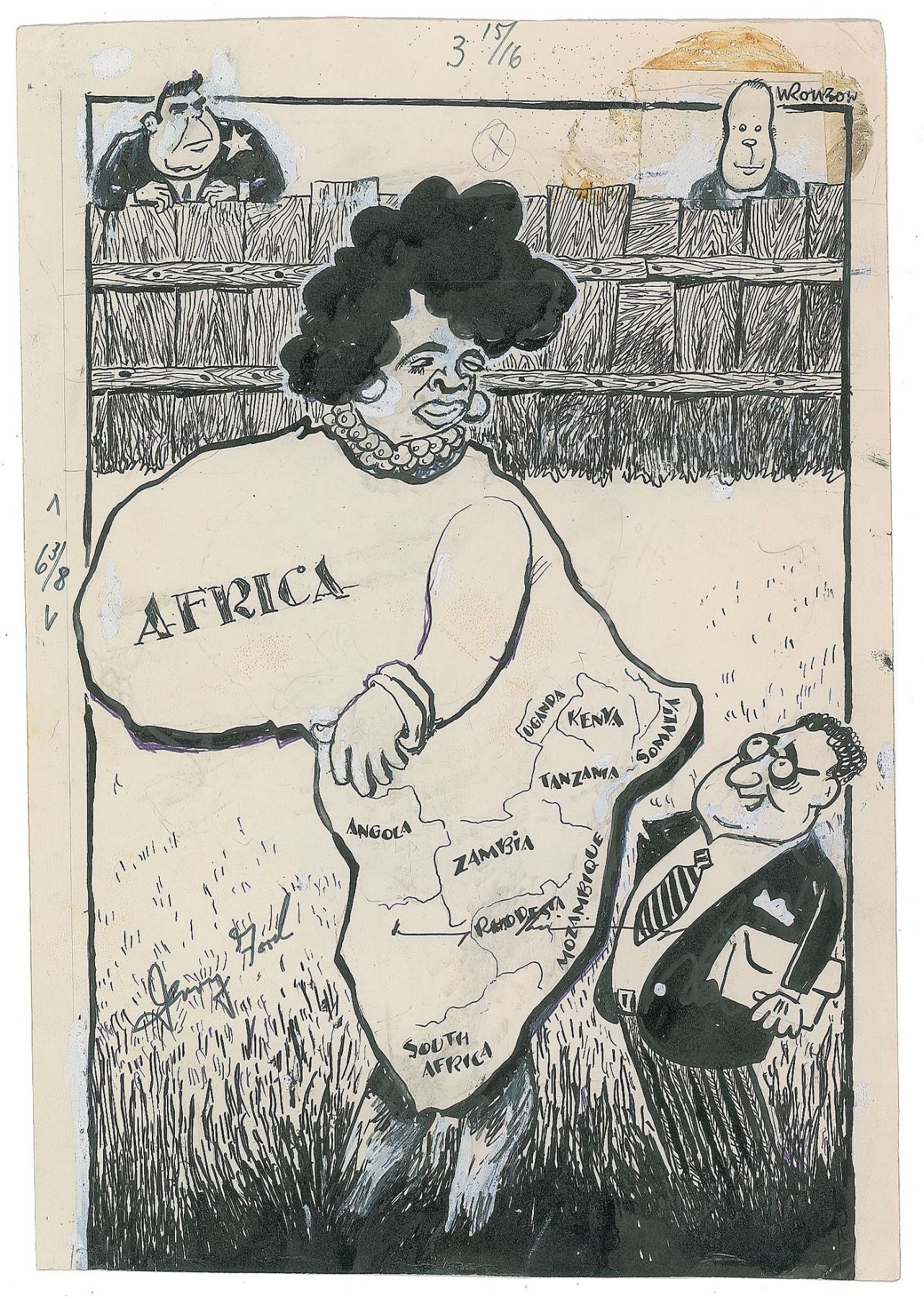 Original signed ink sketch by cartoonist Ludwig Wronkow showing Ford, Kissinger, and Brezhnev looking at a personified African continent on an off-white 9.75 x 14 card, signed in black felt tip, "Jerry Ford," "Henry A. Kissinger," and "Wronkow." This cartoon was published in the German newspaper The Aufbau, with the original newspaper clipping affixed to the reverse; also affixed is related correspondence concerning the autograph request. In very good to fine condition.