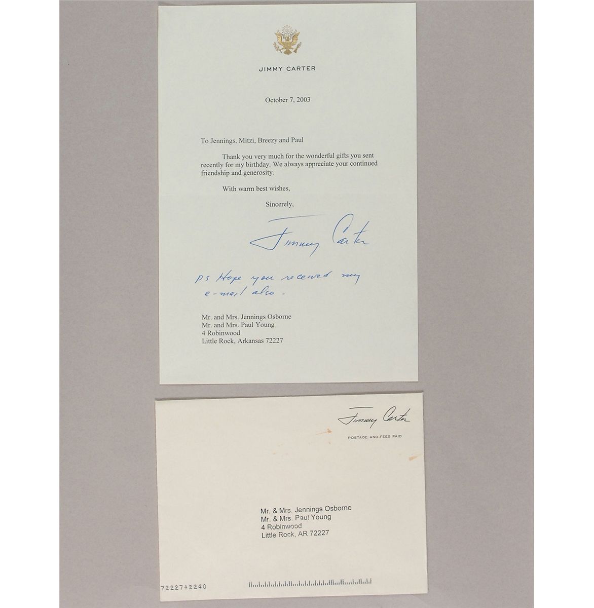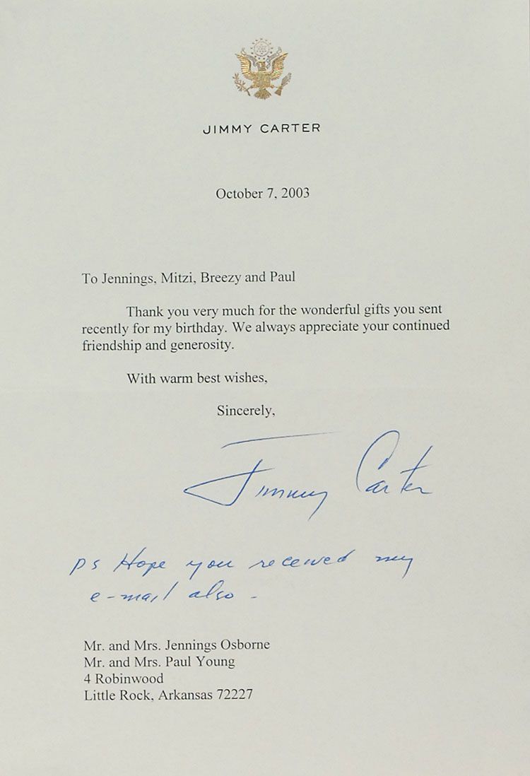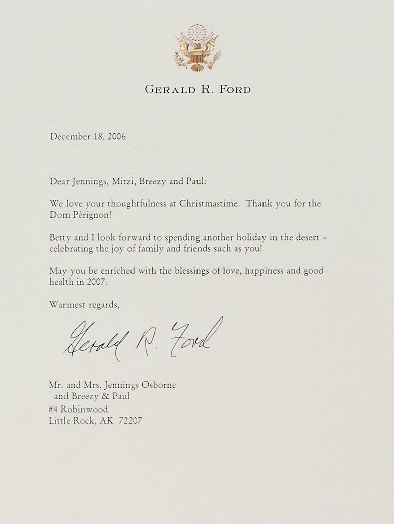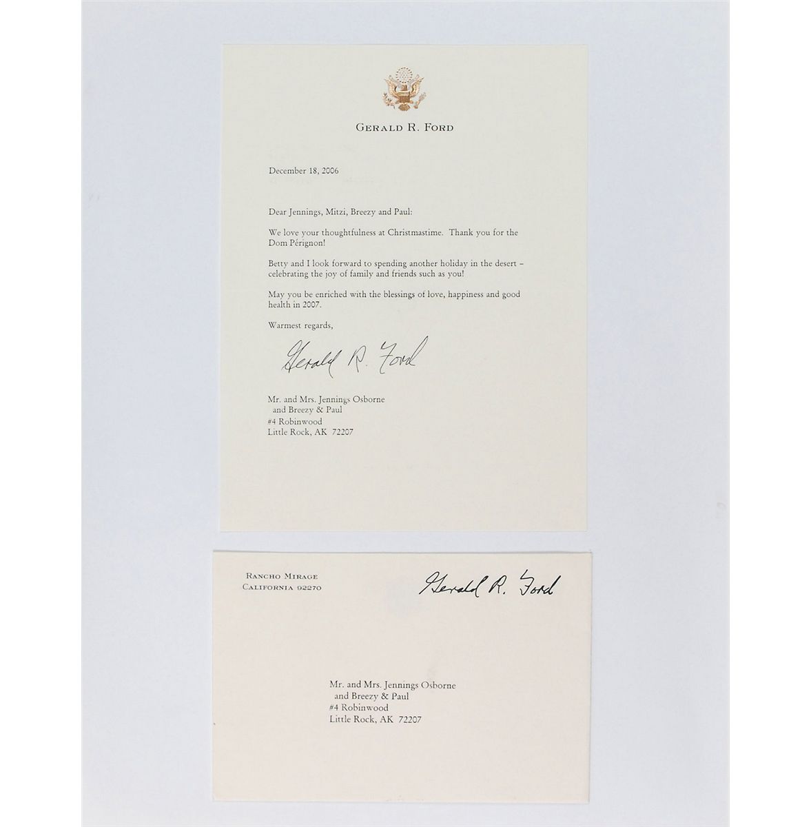 TLS, signed “Gerald R. Ford,” one page, 6.25 x 8.5, personal letterhead, December 18, 2006. Letter of thanks for a Christmas gift. In part: “We love your thoughtfulness at Christmastime. Thank you for the Dom Perignon! Betty and I look forward to spending another holiday in the desert.” Accompanied by the original mailing envelope. The letter and envelope are affixed to an 11.75 x 15.5 scrapbook page, with a Christmas card from the Fords (bearing pre-printed signatures) affixed to the reverse along with another envelope; and a TLS, signed “Jimmy Carter,” one page, 6 x 9, personal letterhead, October 7, 2003. Brief thank you letter. In part: “Thank you very much for the wonderful gifts you sent recently for my birthday.” Under his signature, Carter adds a short handwritten postscript which reads, “Hope you received my e-mail also.” Accompanied by the original mailing envelope. Both the letter and envelope are affixed to an 11.75 x 15.5 scrapbook page. In overall fine condition.