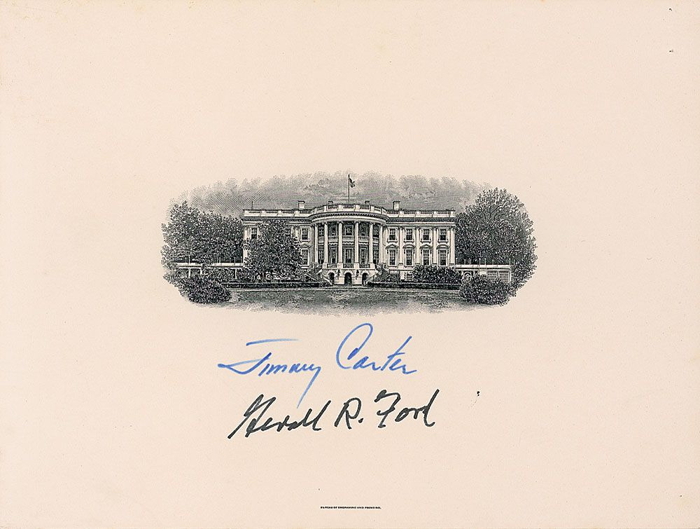 Engraved portrait of the South Lawn of the White House, 8 x 6, signed in blue felt tip, “Jimmy Carter,” and in black felt tip, “Gerald R. Ford.” In fine condition, with a staple hole to top right corner.