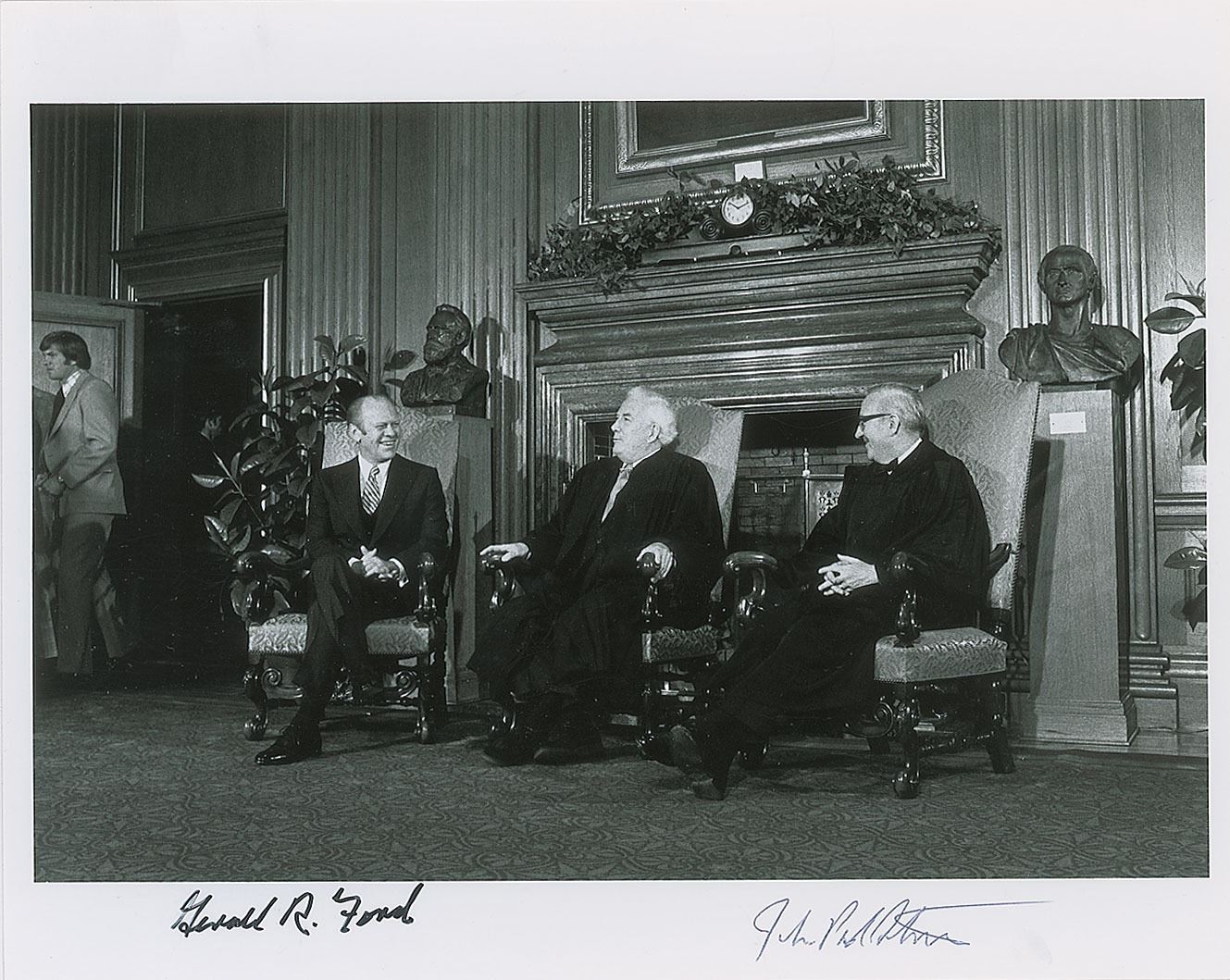 Glossy 10 x 8 photo of President Ford meeting with Chief Justice Warren E. Burger and the newly appointed John Paul Stevens, signed in the lower border in black felt tip, "Gerald R. Ford," and in blue ballpoint, "John Paul Stevens." In fine condition.