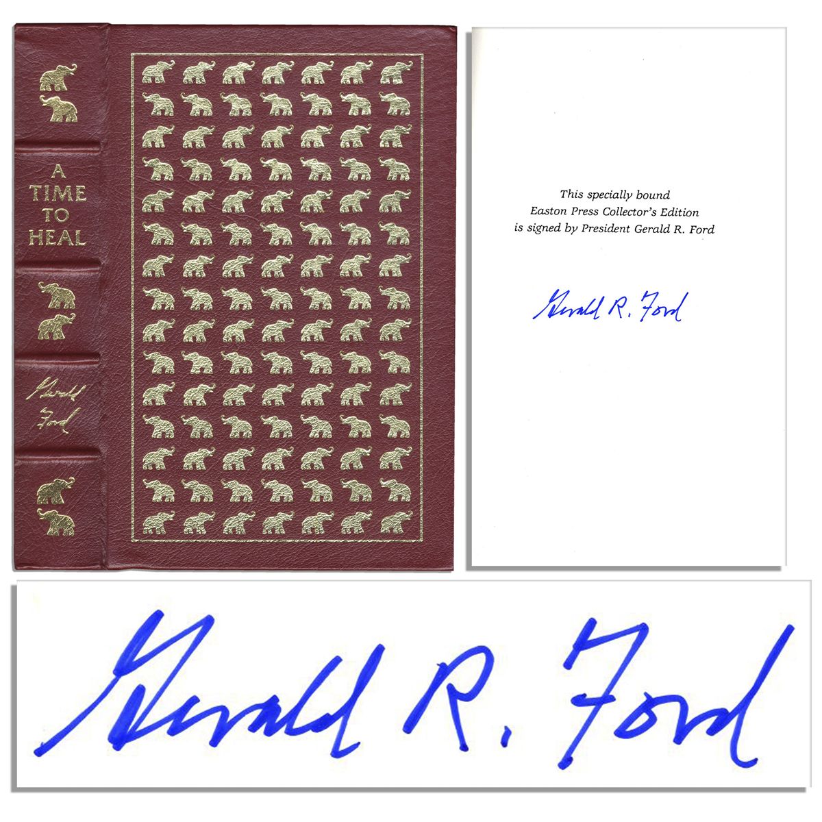 Gerald Ford ''A Time to Heal: The Autobiography of Gerald R. Ford'' signed. Easton Press: Norwalk, CT: 1987. The former President signs in blue ink upon the signature page, ''Gerald R. Ford''. With decorative gilt elephants stamped upon red leather boards, half-tone photographs throughout and a silk ribbon bookmark. Bookplate of previous owner affixed to front pastedown. 6.25'' x 9.5'' book runs 454pp. Near fine condition.