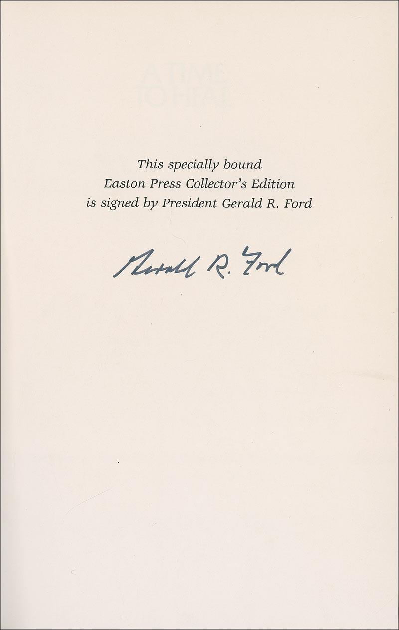 Signed book: A Time to Heal. “Collector’s edition.” Norwalk, Connecticut: Easton Press, 1987. Leather-bound hardcover, 6.5 x 9.5, 454 pages. Signed in black felt tip on a specially printed prefatory page “Gerald R. Ford.” In very fine condition.