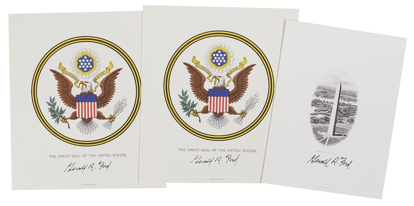 Three items: an engraved portrait of the Washington Monument, 6 x 8, by the Bureau of Engraving and Printing, signed in black felt tip; and two identical printed color Great Seals of the United States, 7.5 x 9, each signed in black felt tip. In very fine condition.