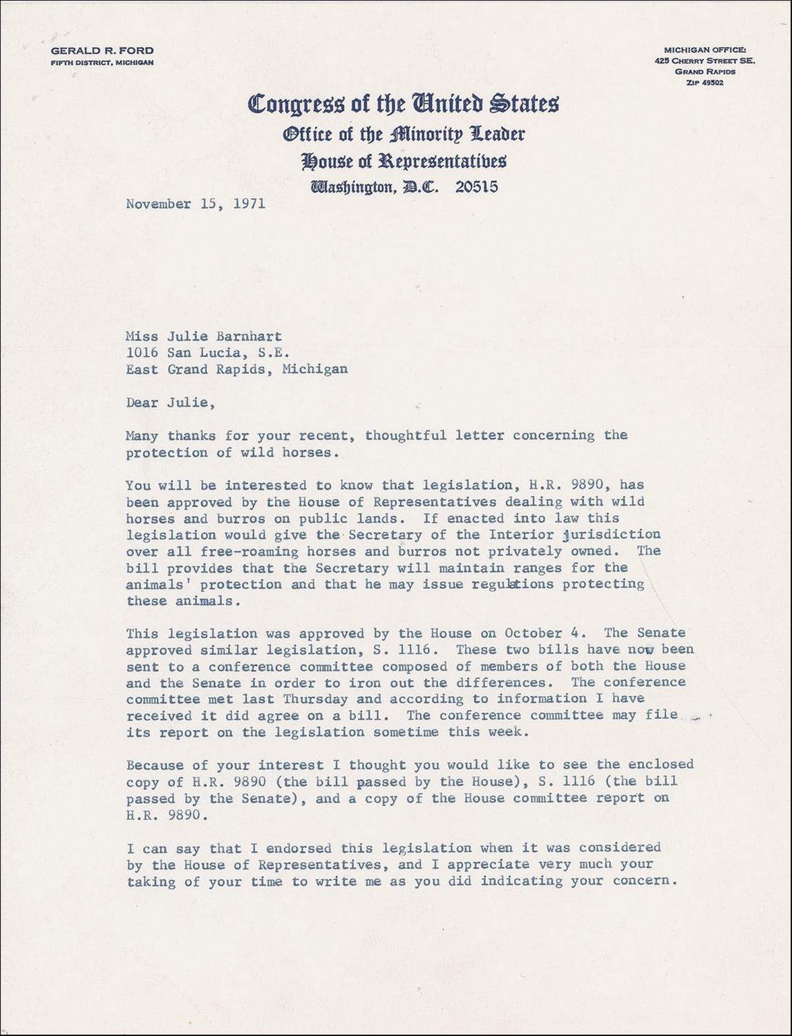 TLS signed “Jerry Ford,” two pages, 8 x 10.5, Congress of the United States letterhead, November 15, 1971. Letter to a Michigan constituent. In part: “Many thanks for your recent, thoughtful letter concerning the protection of wild horses. You will be interested to know that legislation, H.R. 9890, has been approved by the House of Representatives dealing with wild horses and burros on public lands. If enacted into law this legislation would give the Secretary of the Interior jurisdiction over all free-roaming horses and burros not privately owned. The bill provides that the Secretary will maintain ranges for the animals’ protection and that he may issue regulations protecting these animals.” In fine condition, with staple holes to top left corner of both pages, and four small pinholes to blank portion of second page.