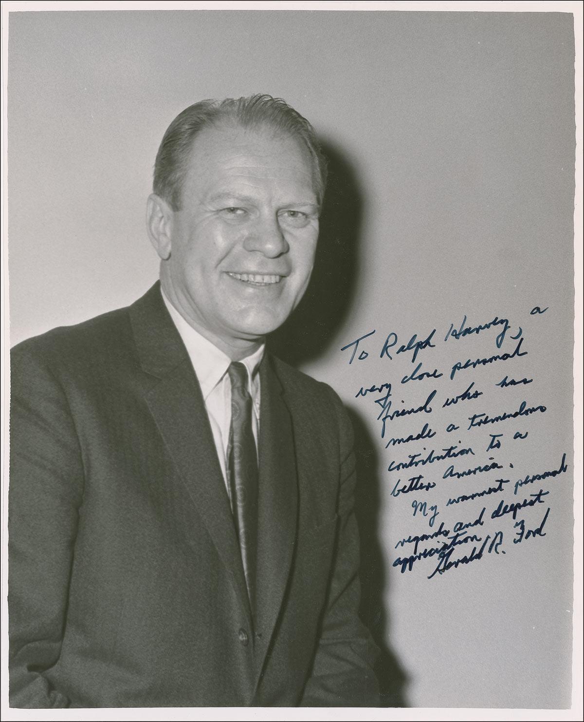 Vintage glossy 8 x 10 photo, signed and inscribed in fountain pen “To Ralph Harvey, a very close personal friend who has made a tremendous contribution to a better America. My warmest personal regards and deepest appreciation. Gerald R. Ford.” In fine condition, with some scattered light surface marks and impressions, and some light crazing to finish.