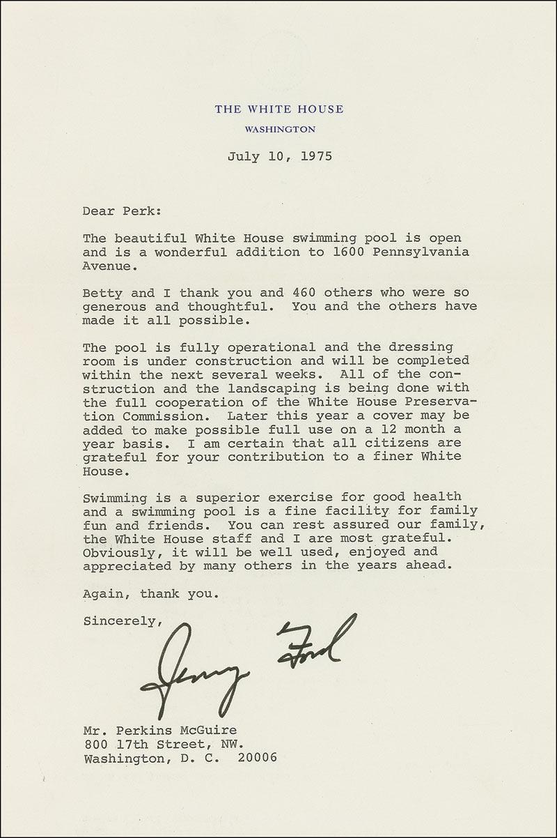 TLS as president signed “Jerry Ford,” one page, 7 x 10.5, White House letterhead, July 10, 1975. Ford thanks E. Perkins McGuire, chairman of the Commission on Government procurement, for his contribution to a White House pool. In part: “The beautiful White House swimming pool is open and is a wonderful addition to 1600 Pennsylvania Avenue. Betty and I thank you and 460 others who were so generous and thoughtful…The pool is fully operational and the dressing room is under construction and will be completed within the next several weeks…Swimming is a superior exercise for good health and a swimming pool is a fine facility for family fun and friends. You can rest assured our family, the White House staff and I are most grateful.” In fine condition. Accompanied by the original mailing envelope. Unusual presidential content!