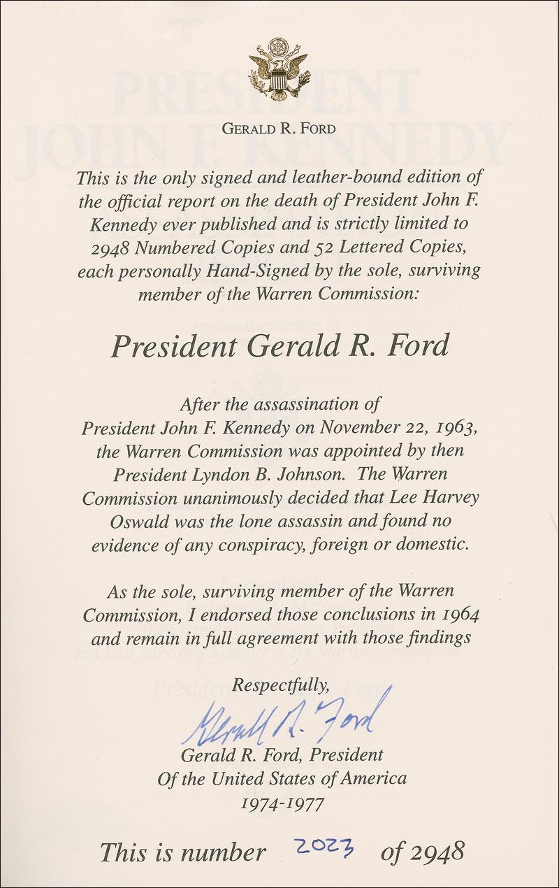 Signed book: President John F. Kennedy: Assassination Report of the Warren Commission. Limited edition of 2,948 numbered copies (this copy No. 2023). Nashville: FlatSigned Press, 2004. Leather-bound hardcover, 6.5 x 9.5. Signed in blue ink on the limitation page “Gerald R. Ford.” In very fine condition. Accompanied by a photo taken at time of private signing.