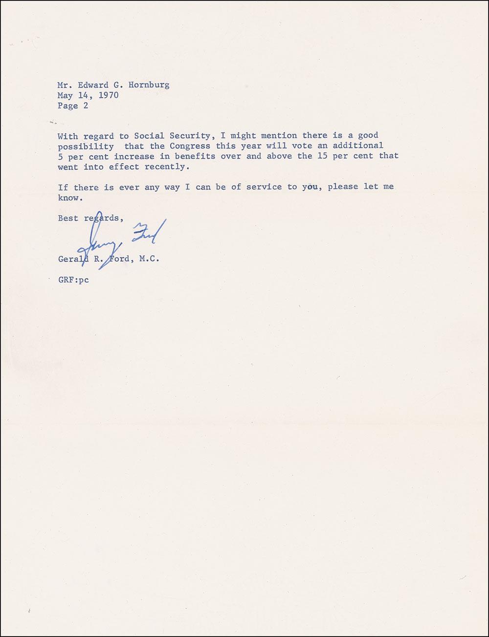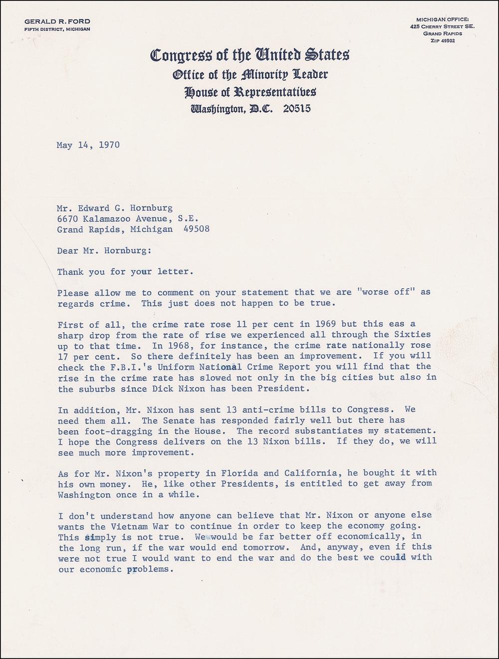 TLS signed “Jerry Ford,” two pages, 8 x 10.5, Congress of the United States letterhead, May 14, 1970. Ford, as House minority leader, writes a Grand Rapids, Michigan, voter. In part: “Please allow me to comment on your statement that we are ‘worse off’ as regards crime. This just does not happen to be true…First of all, the crime rate rose 11 per cent in 1969 but this was a sharp drop from the rate of rise we experienced all through the Sixties up to that time…If you will check the F.B.I.’s Uniform National Crime Report you will find that the rise in the crime rate has slowed not only in the big cities but also in the suburbs since Dick Nixon has been President. In addition, Mr. Nixon has sent 13 anti-crime bills to Congress. We need them all…As for Mr. Nixon’s property in Florida and California, he bought it with his own money. He, like other Presidents, is entitled to get away from Washington once in a while. I don’t understand how anyone can believe that Mr. Nixon or anyone else wants the Vietnam War to continue to keep the economy going. This simply is not true. We would be far better off economically, in the long run, if the war would end tomorrow. And, anyway, eve if this were not true I would want to end the war and do the best we could with our economic problems.” In fine condition, with some light scattered creasing and staple holes at the top left corner.