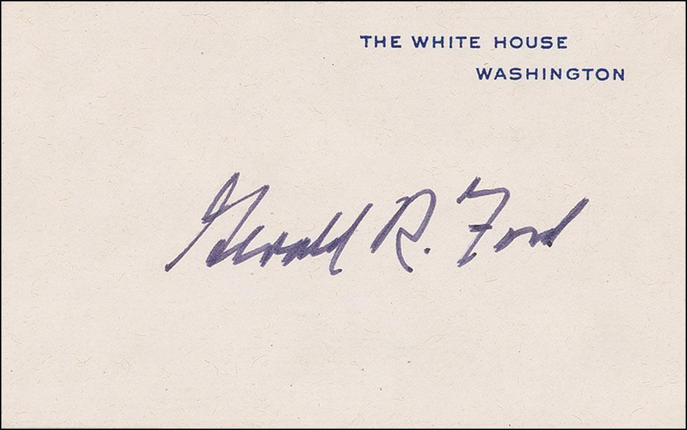 Mock White House card, 4 x 2.5, signed in felt tip, “Gerald R. Ford.” In fine condition. Accompanied by a full letter of authenticity from PSA/DNA.