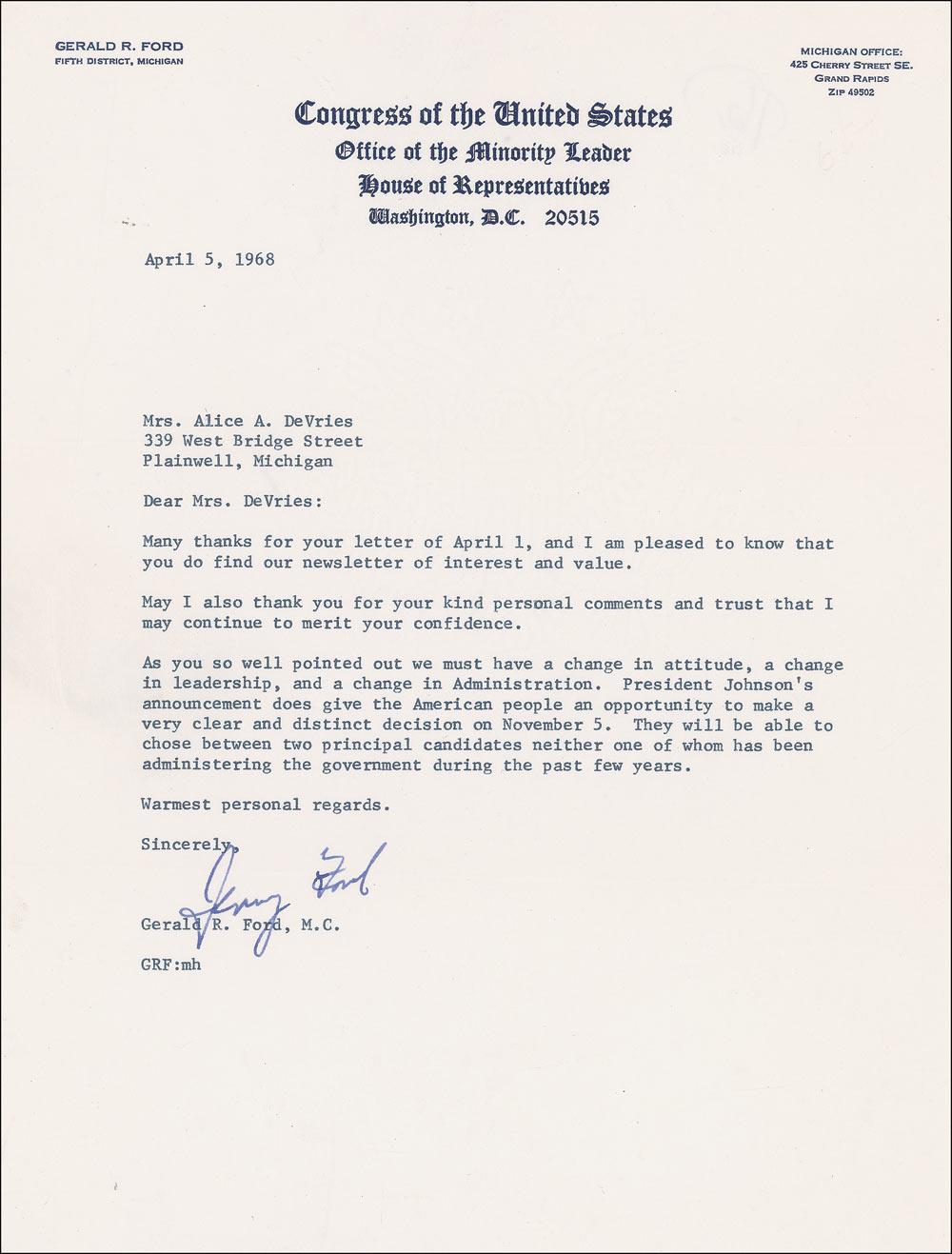 TLS signed “Jerry Ford,” one page, 8 x 10.5, Congress of the United States letterhead, April 5, 1968. Ford responds to a Michigan constituent. In part: “As you so well pointed out we must have a change in attitude, a change in leadership, and a change in Administration. President Johnson’s announcement does not give the American people an opportunity to make a very clear and distinct decision on November 5. They will be able to chose [sic] between two principal candidates neither one of whom has been administering the government during the past few years.” In fine condition, with light crease at the top left side, fold through part of the signature, and a few wrinkles.