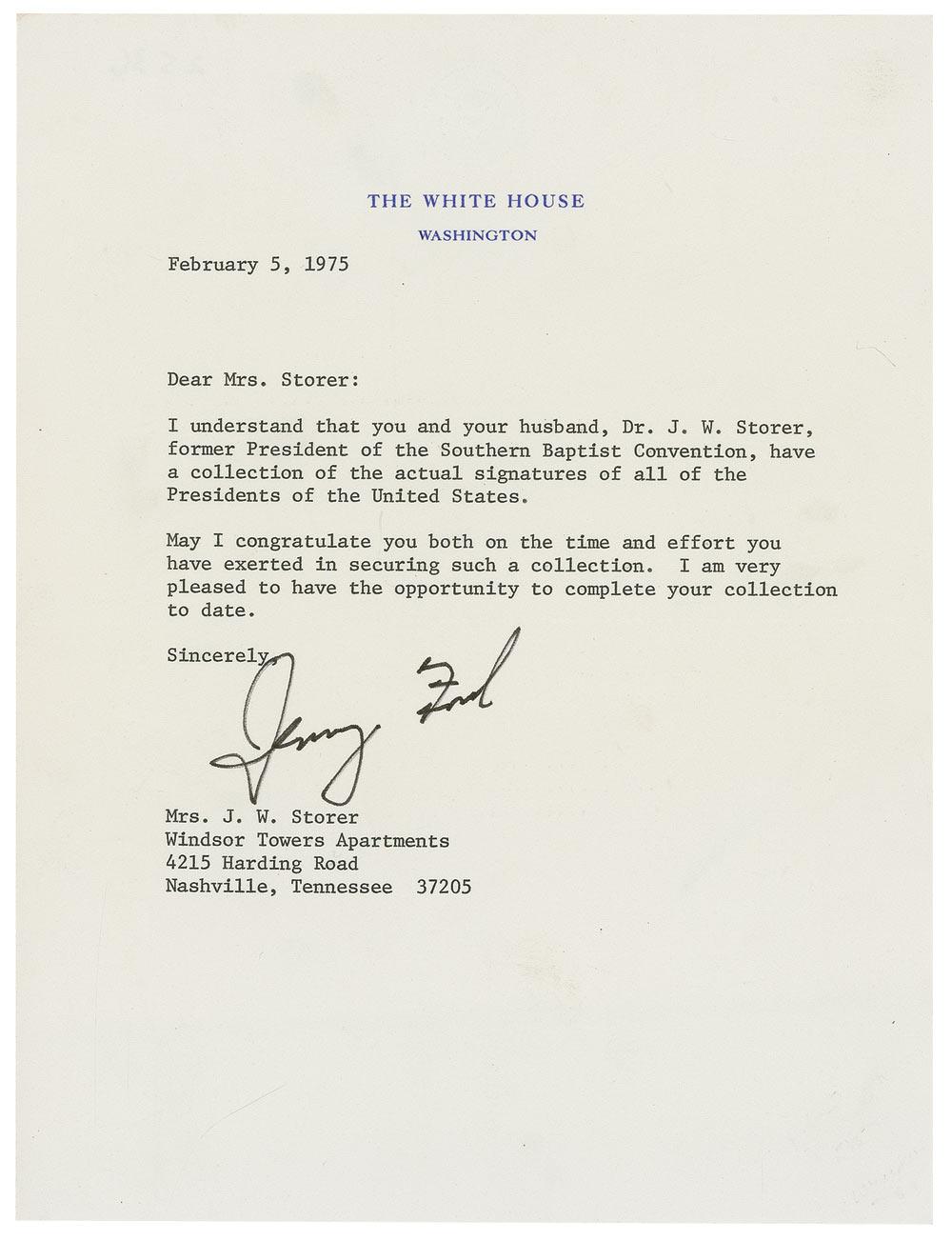 TLS as president signed “Jerry Ford,” one page, 6.75 x 8.75, White House letterhead, February 5, 1975. Letter to a collector. In full: “I understand that you and your husband, Dr. J. W. Storer, former President of the Southern Baptist Convention, have a collection of the actual signatures of all the Presidents of the United States. May I congratulate you both on the time and effort you have exerted in securing such a collection. I am very pleased to have the opportunity to complete your collection to date.” In fine condition.