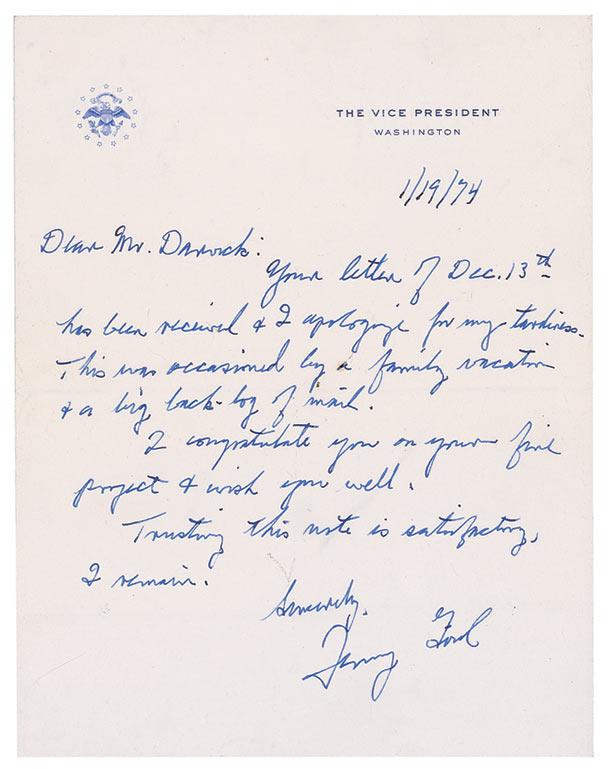 ALS signed “Jerry Ford,” one page, 7 x 9, Vice President letterhead, January 19, 1974. Letter to Mr. Darvick. In full: “Your letter of Dec. 13th has been received & I apologize for my tardiness. This was occassioned by a family vacation & a big back log of mail. I congratulate you on your fine project & wish you well. Trusting this note is satisfactory…” In fine condition.