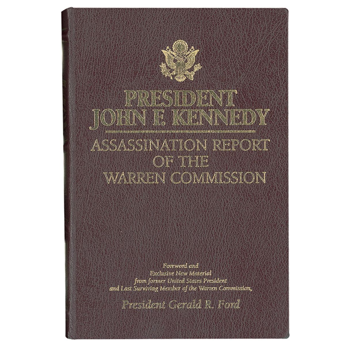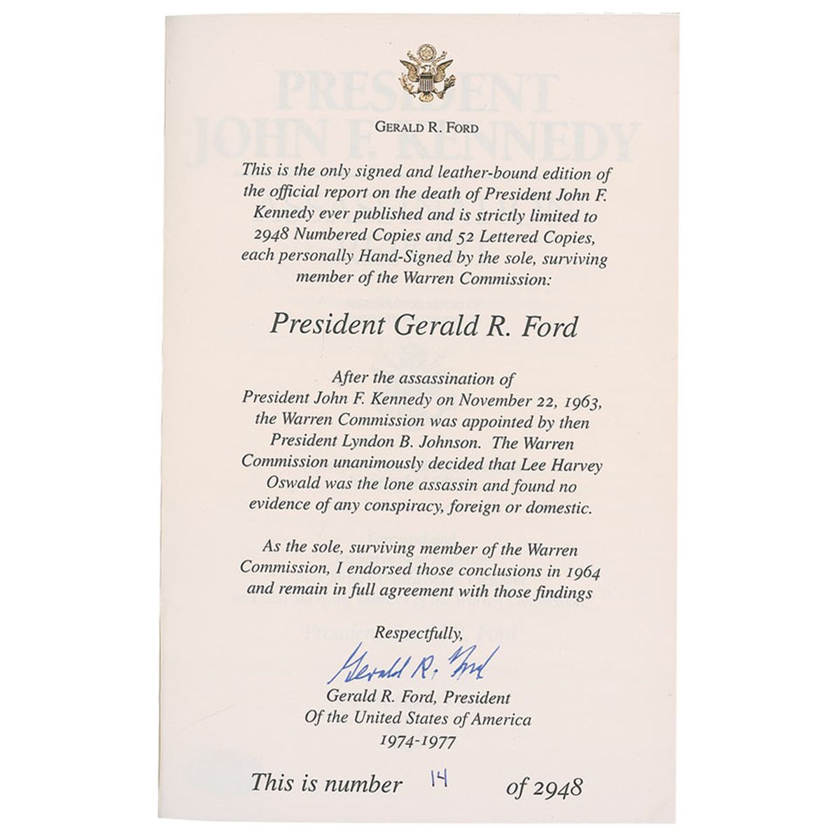 Signed book: President John F. Kennedy: Assassination Report of the Warren Commission. Limited edition of 2,948 numbered copies (this copy No. 14). Nashville: FlatSigned Press, 2004. Leather-bound hardcover, 6.5 x 9.5. Signed in blue ink on the limitation page “Gerald R. Ford.” In fine condition. Accompanied by a photo taken at time of private signing.