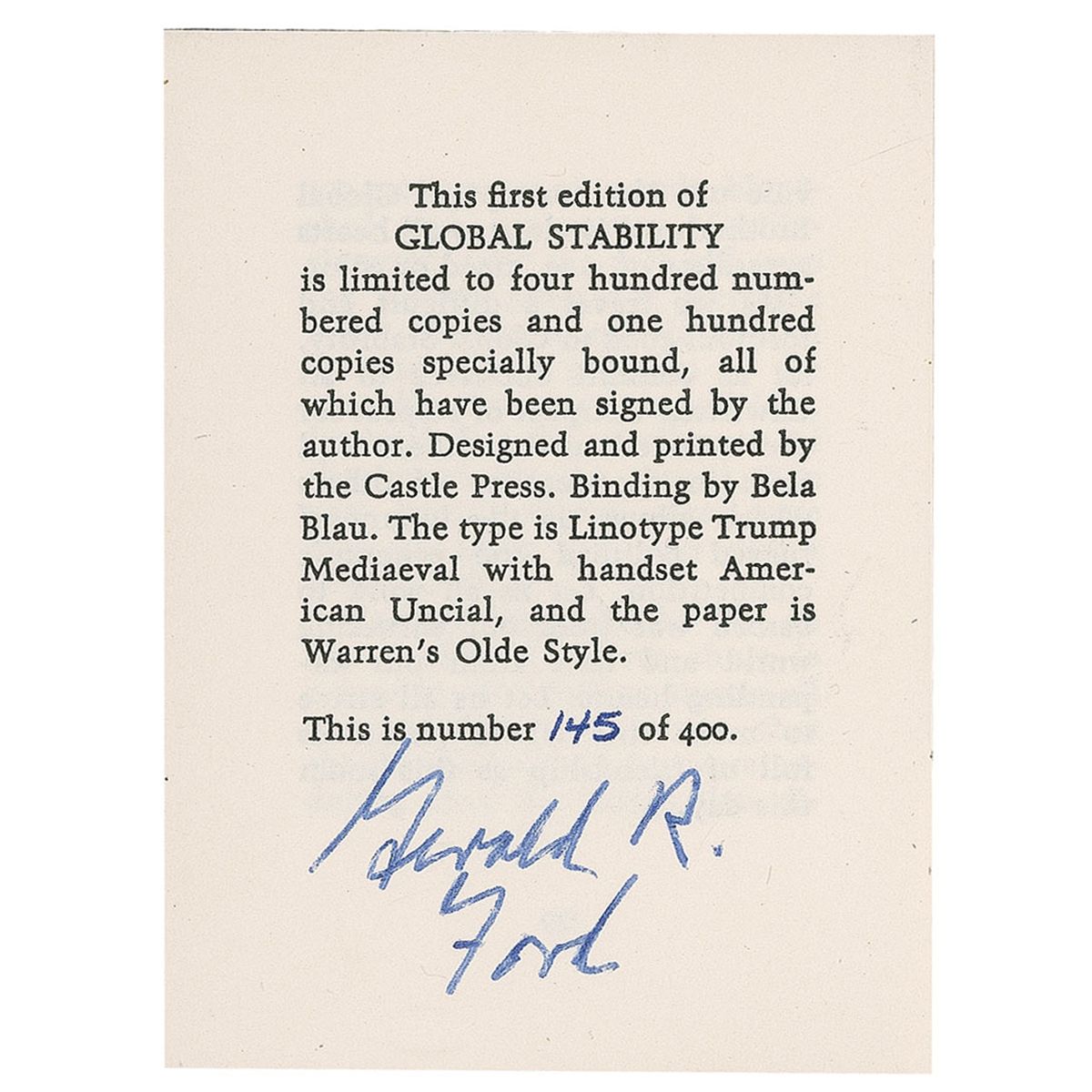 Signed book: Global Stability. Limited edition first edition of 400 copies (this No. 145). Northridge, California: Lord John Press, 1981. Hardcover. 30 pages. 2.25 x 3. A miniature edition of Ford’s address given at the Visa International, Quebec, on September 8, 1980, boldly signed by Ford on the colophon page. Small tear along the spine and hinge, and several surface impressions to the front board, otherwise fine condition.