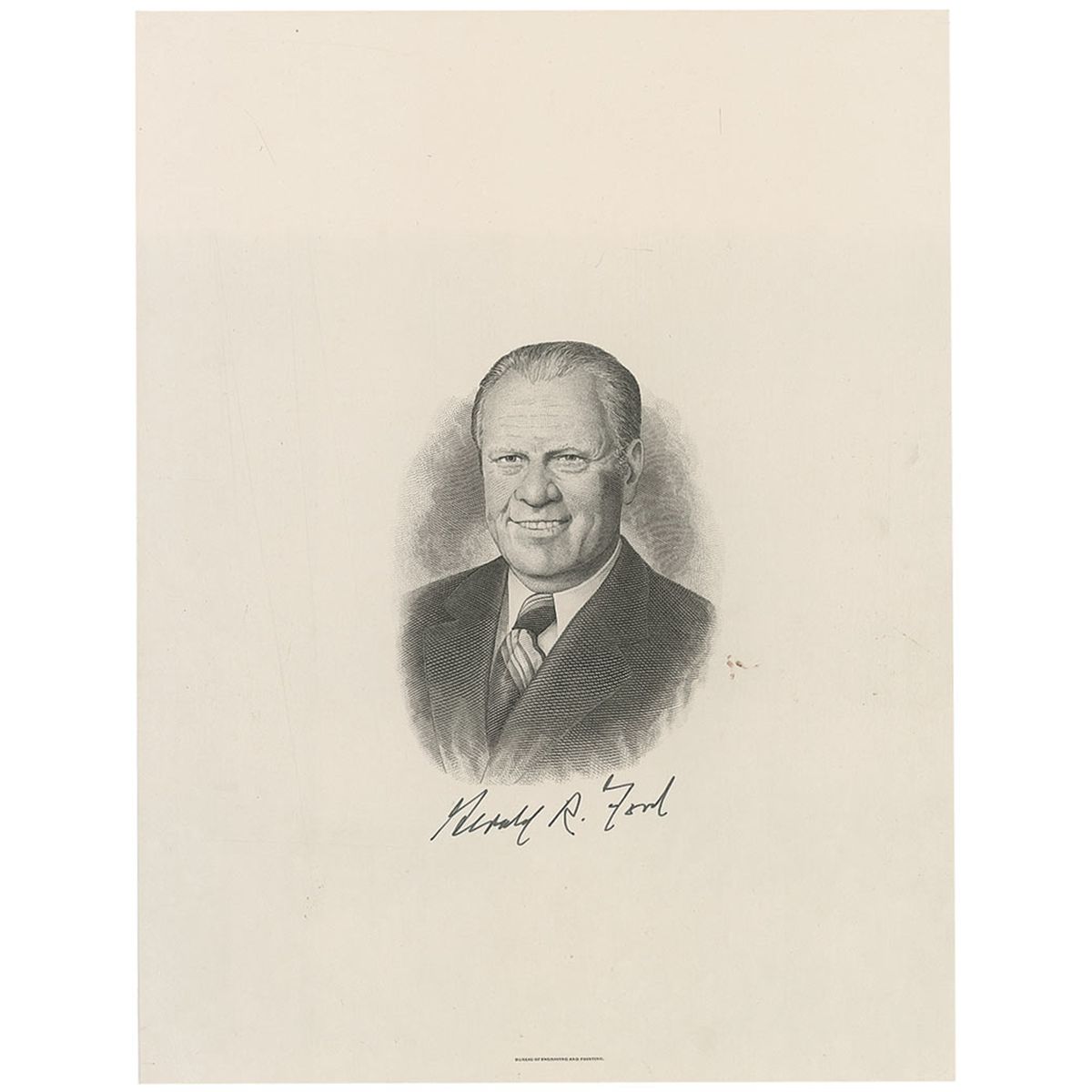 Engraved portrait, 9 x 12, by the Bureau of Engraving and Printing, signed under his image in black felt tip, “Gerald R. Ford.” Some scattered light creases and wrinkles, and a small bit of soiling next to image, otherwise fine condition.