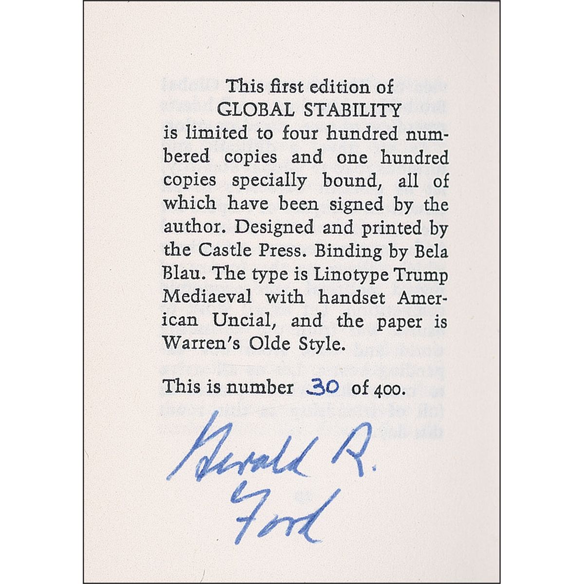 Signed book: Global Stability. Limited edition first edition of 400 copies (this No. 30). Northridge, California: Lord John Press, 1981. Hardcover. 30 pages. 2.25 x 3. A miniature edition of Ford’s address given at the Visa International, Quebec, on September 8, 1980, boldly signed by Ford on the colophon page. In fine condition.