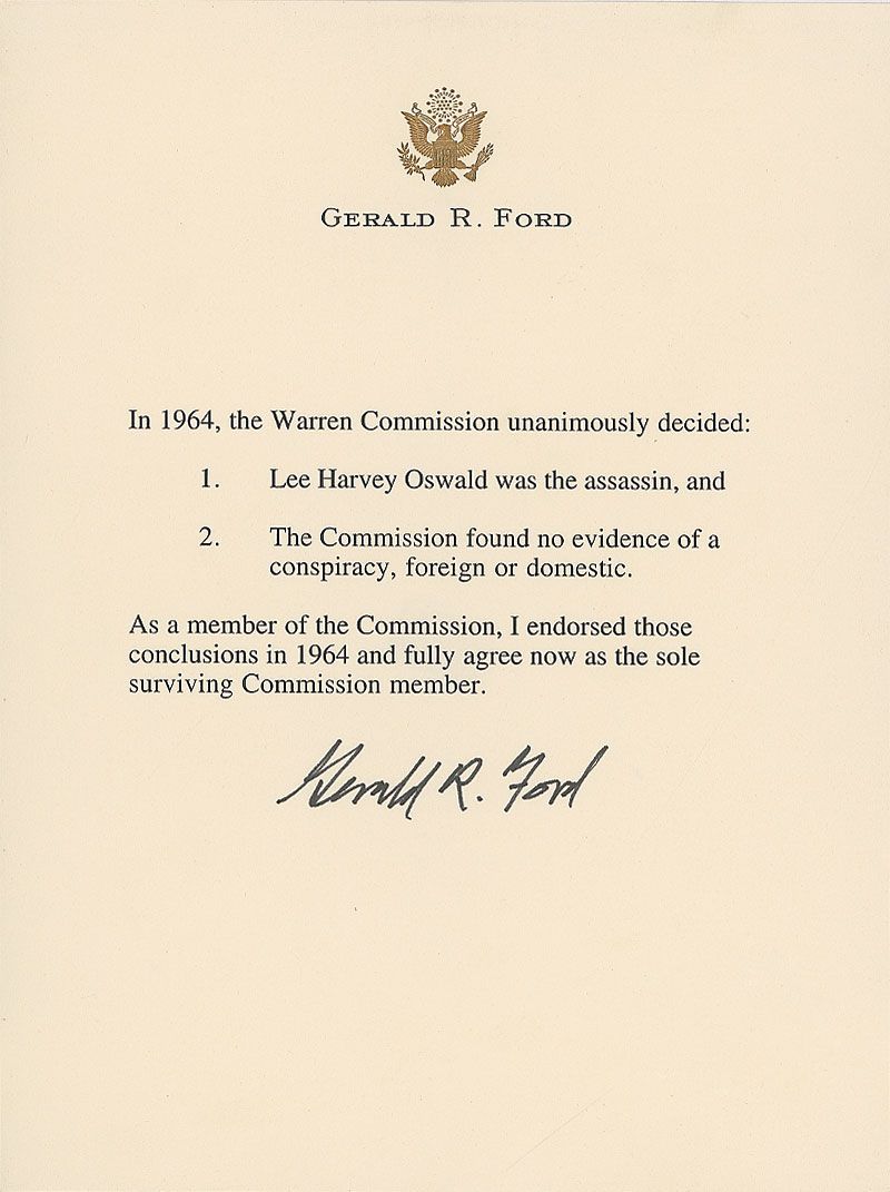 Souvenir typescript on a cream 6.25 x 8.25 sheet of personal letterhead with embossed presidential eagle, signed in black felt tip “Gerald R. Ford.” Ford’s statement regarding the findings of the Warren Commission. In full: “In 1964, the Warren Commission unanimously decided: 1. Lee Harvey Oswald was the assassin, and 2. The Commission found no evidence of a conspiracy, foreign or domestic. As a member of the Commission, I endorsed those conclusions in 1964 and fully agree now as the sole surviving Commission member.” In fine condition.