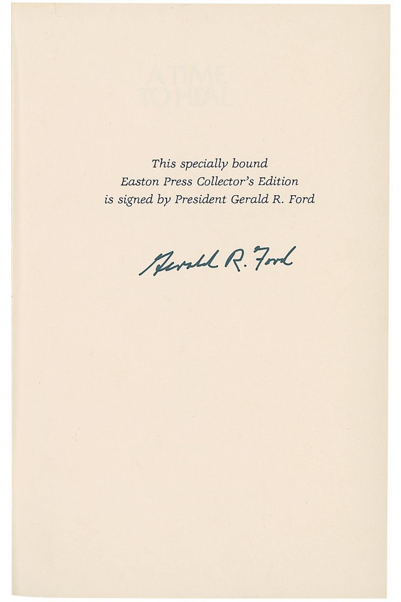 Signed book: A Time to Heal. Collector’s edition. Norwalk, Connecticut: Easton Press, 1987. Leather-bound hardcover, 6.5 x 9.5, 454 pages. Signed in black felt tip on a specially printed prefatory page “Gerald R. Ford.” In very fine condition.