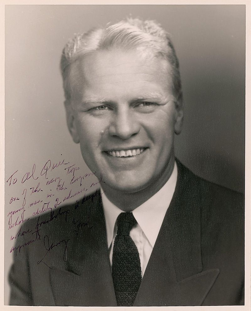 Vintage glossy 8 x 9.75 photo of a young Ford, signed and inscribed in black ink “To Al Quie one of the very top young men in the Congress whose ability I admire and whose friendship I deeply appreciate. Jerry Ford.” Scattered light creases, bends, and surface marks, and a paperclip impression to top edge, otherwise fine condition.