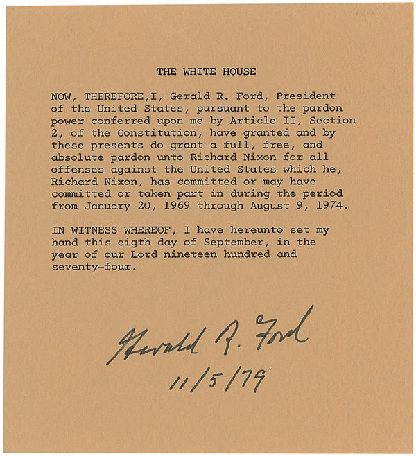 Souvenir typescript of Ford’s presidential pardon granted to Richard Nixon, one page, 5.5 x 6. In part: “I, Gerald R. Ford, President of the United States…do grant a full, free, and absolute pardon unto Richard Nixon for all offenses against the United States which he…may have committed or taken part in during the period from January 20, 1969 through August 9, 1974.” Signed at the conclusion in black felt tip, “Gerald R. Ford, 11/5/79.” In fine condition.