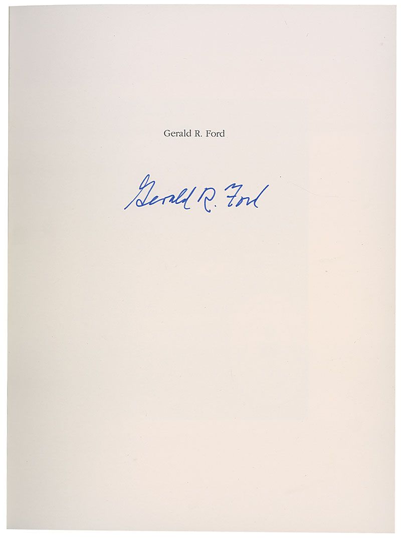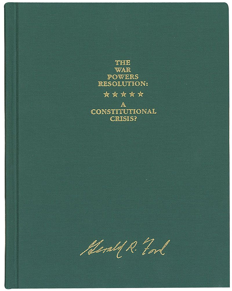 Signed book: The War Powers Resolution: A Constitutional Crisis. First edition, limited issue numbered #38/200. Oroville, California: Butte College Press, 1992. Hardcover 7.25 x 9.25, 109 pages. Signed on a prefatory page in blue ink, “Gerald R. Ford.” In
