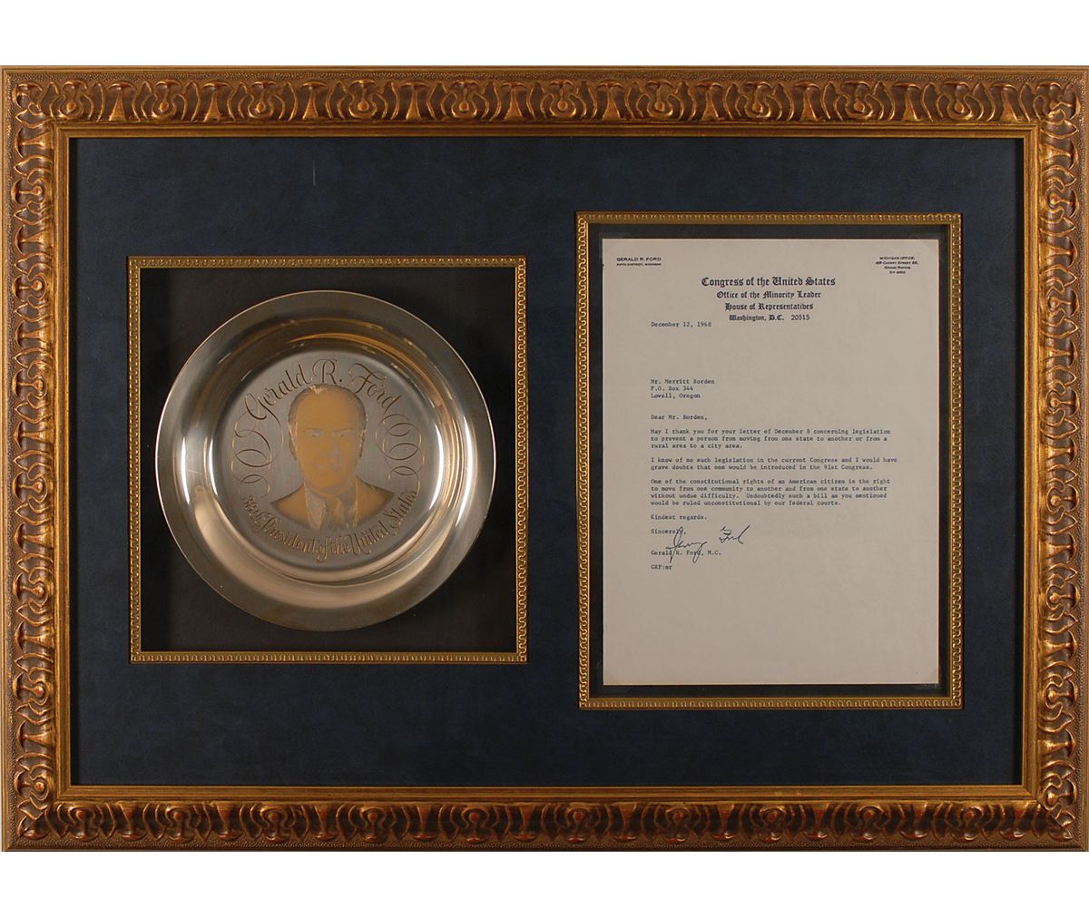 TLS signed “Jerry Ford,” one page, 7.75 x 10.25, Congress of the United States letterhead, December 12, 1968. Letter regarding legislation. In part: “Concerning legislation to prevent a person from moving from one state to another or from rural area to a city area…One of the constitutional rights of an American citizen is the right to move from one community to another and from one state to another without undue difficulty.” Magnificently mounted, matted, and framed with an etched commemorative plate to an overall size of 26 x 19. In fine condition, with a horizontal mailing fold passing through the signature and a trivial ding to the upper left edge. Oversized.