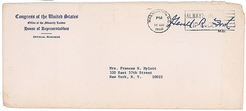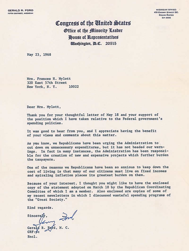 TLS signed “Jerry Ford,” one page, 8 x 10.5, Congress of the United States letterhead, May 23, 1968. In part: “Thank you for your thoughtful Letter…and your support of the position which I have taken relative to the Federal government’s spending policies…As you know, we Republicans have been urging the Administration to cut down on unnecessary expenditures, but it has not heeded our warnings. In fact in many instances, the Administration has been responsible for the creation of new and expensive projects which further burden the taxpayers. One of the reasons we Republicans have been so anxious to keep down the cost of living is that many of our citizens must live on fixed incomes and spiraling inflation places its greatest burden on them.” In fine condition. Accompanied by the original mailing envelope. Despite the best effort of Ford and his fellow Republicans, the Johnson administration passed 84 bills through Congress, many as part of LBJ’s ‘Great Society.’