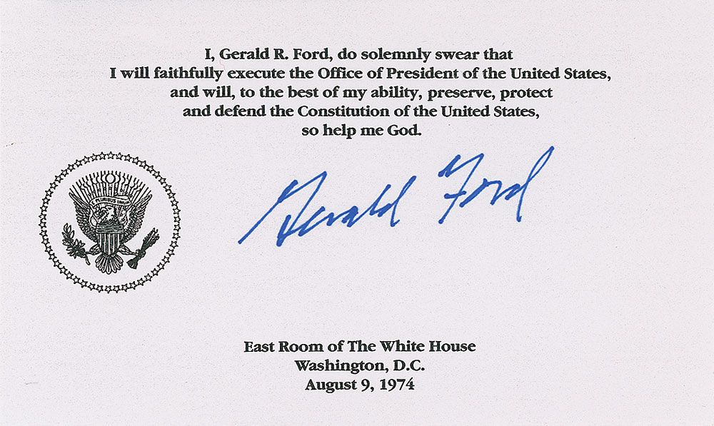 Felt tip signature, “Gerald Ford,” on a white 5 x 3 card, to which was later added the presidential Oath of Office and an image of the presidential seal. In very fine condition.