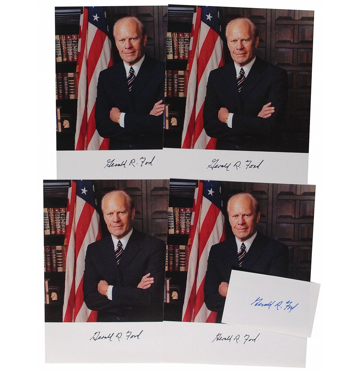 Four identical color paperstock 8 x 10 photos, each signed in the lower border in black felt tip, “Gerald R. Ford”; and a blue felt tip signature, “Gerald R. Ford,” on an off-white 5 x 3 card. In fine condition.