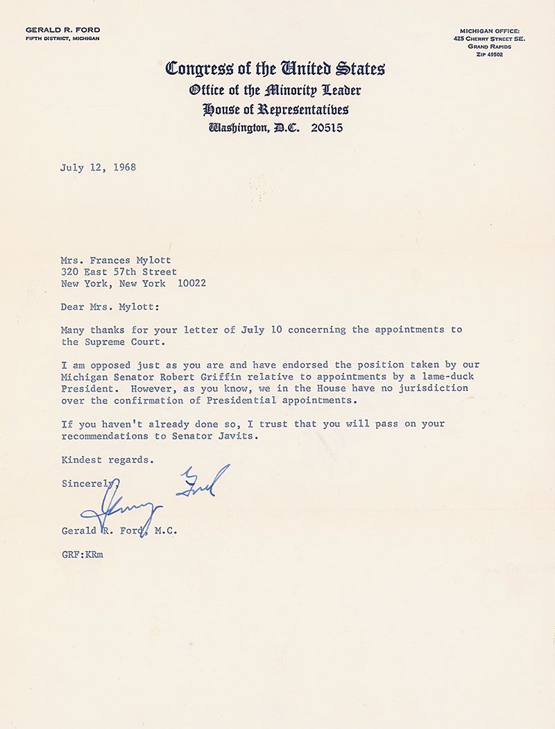 TLS signed “Jerry Ford,” one page, 8 x 10.5, Congress of the United States, Office of the Minority Leader letterhead, July 12, 1968. Letter to Mrs. Frances Mylott. In full: “Many thanks for your letter of July 10 concerning appointments to the Supreme Court. I am opposed just as you are and have endorsed the position taken by our Michigan Senator Robert Griffin relative to appointments by a lame-duck President. However, as you know, we in the House have no jurisdiction over the confirmation of Presidential appointments. If you haven’t already done so, I trust that you will pass on your recommendations to Senator Javits.” In fine condition. Accompanied by the original mailing envelope, with several notations in an unknown hand, that appear to be quotes from other politicians.