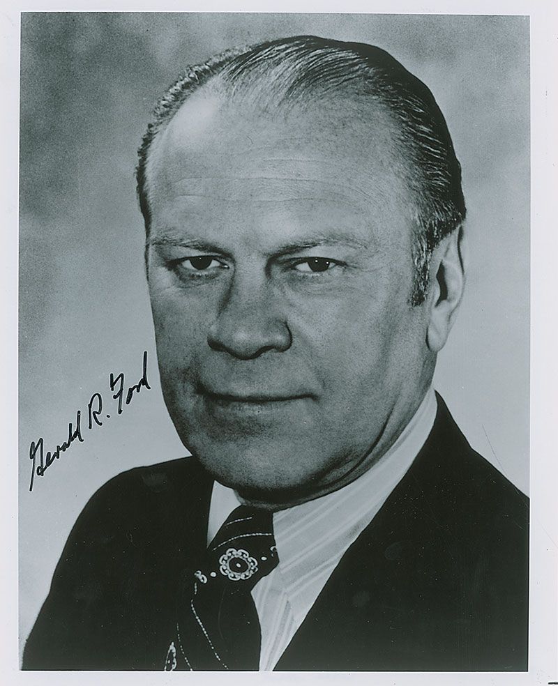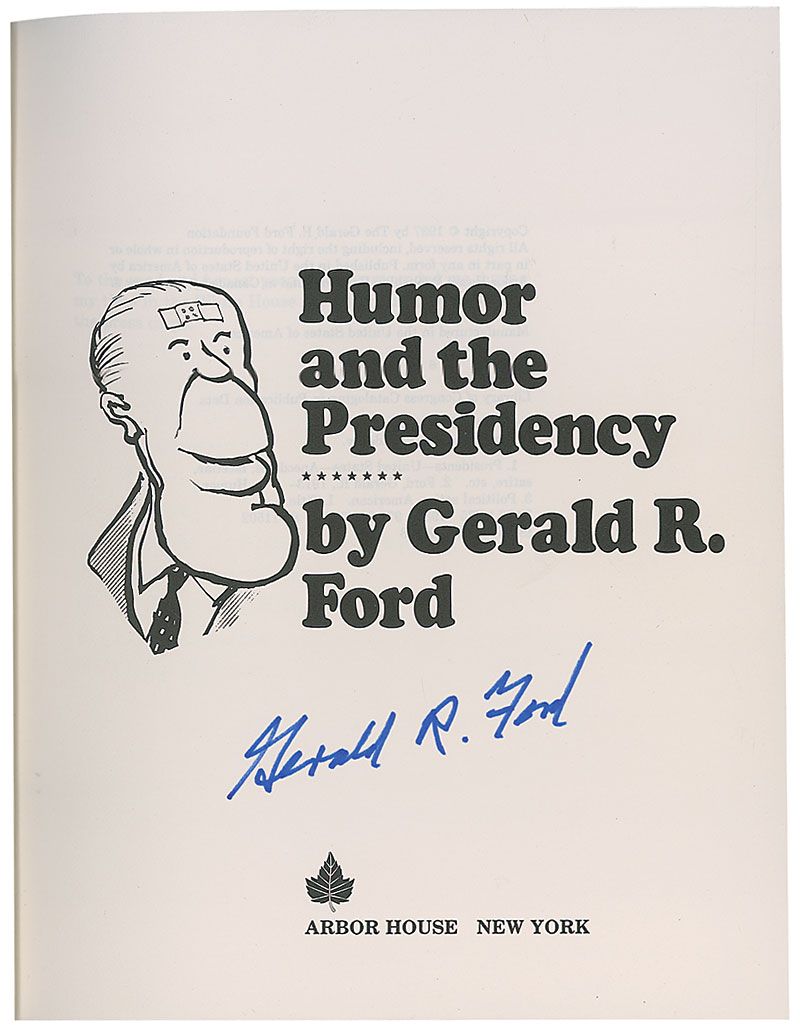 Two items: one hardcover first edition of Humor and the Presidency, 7.75 x 9.5, 162 pages, signed on the title page in blue felt tip; and a glossy 8 x 9.75 head-and-shoulders photo of Ford, signed in black felt tip. In overall fine condition, with the inner flap of the dust jacket slightly trimmed. July 2013 is the centennial of Ford’s birth.