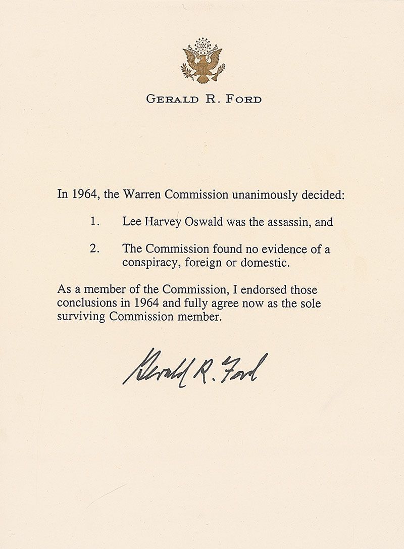 Souvenir typescript on a cream 6.25 x 8.5 sheet of personal letterhead with embossed presidential eagle, signed in black felt tip, “Gerald R. Ford.” Ford’s statement regarding the findings of the Warren Commission. In full: “In 1964, the Warren Commission unanimously decided: 1. Lee Harvey Oswald was the assassin, and 2. The Commission found no evidence of a conspiracy, foreign or domestic. As a member of the Commission, I endorsed these conclusions in 1964 and fully agree now as the sole surviving Commission member.” In very fine condition.