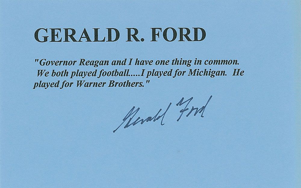 Felt tip signature, “Gerald Ford,” on a 6.25 x 4 light blue card, to which was later added a quote from Ford about Ronald Reagan which reads, “Governor Reagan and I have one thing in common. We both played football…I played for Michigan. He played for Warner Brothers.” In fine condition.